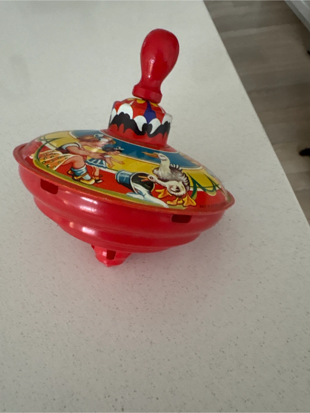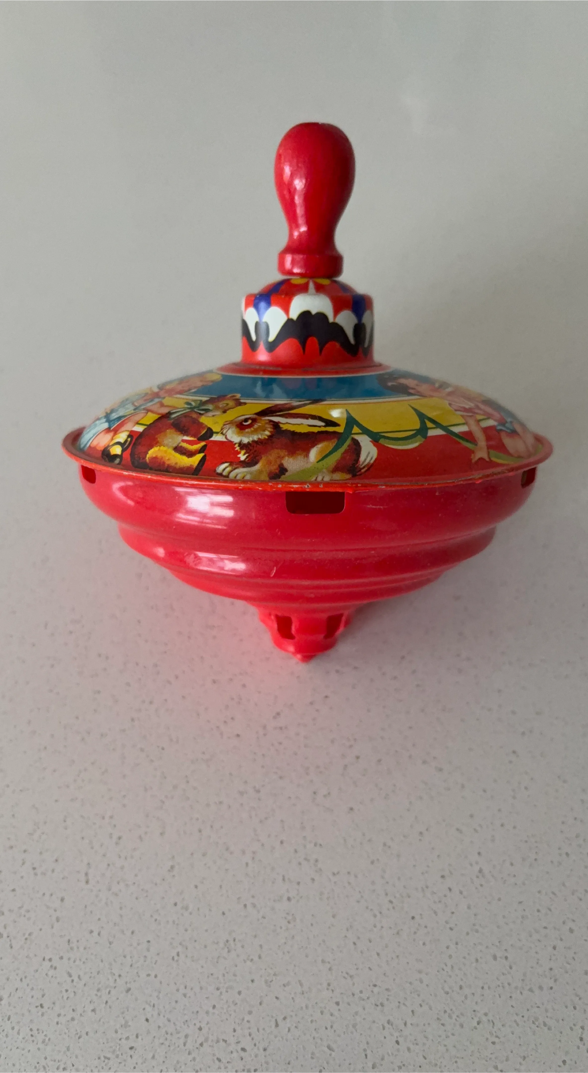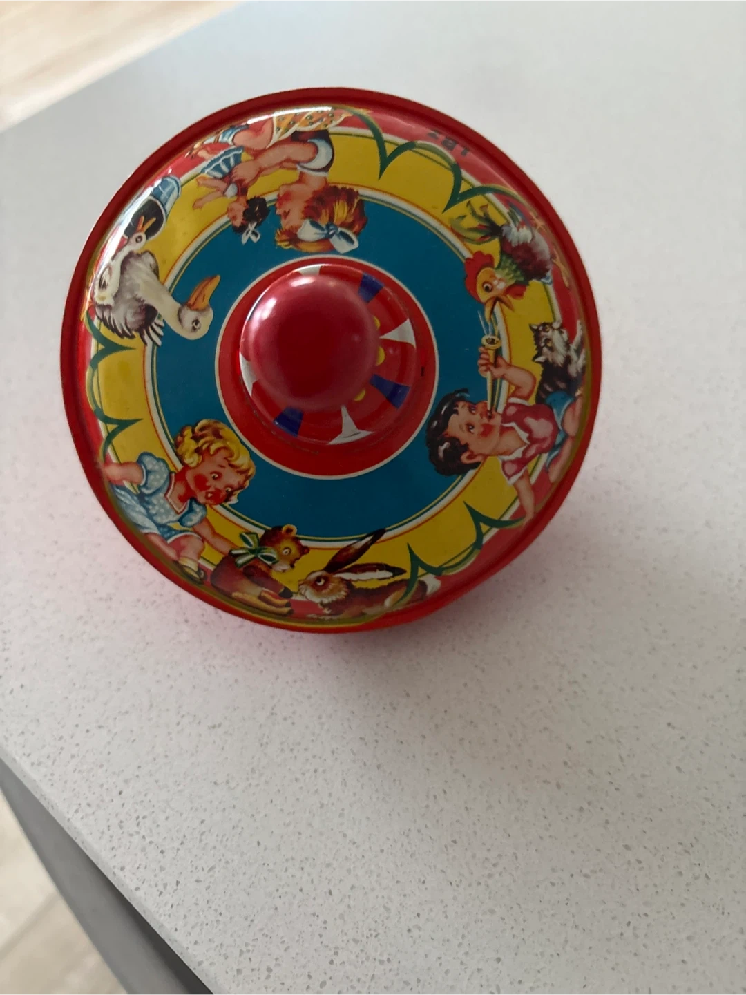 Vintage- 1970’s. This is a colourful tin litho spinning top with playful illustrations. It features children, a goose, a rooster, and a rabbit. Made of tin and plastic for the handle.