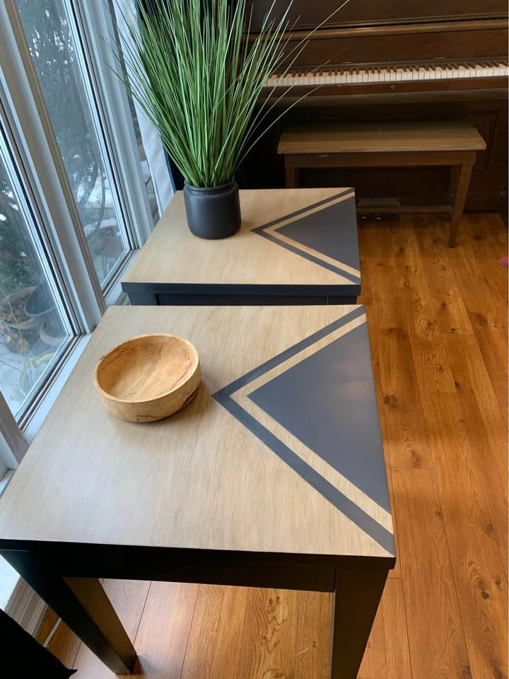 These refinished solid wood modern side tables feature a walnut glaze and black finish with a contrasting geometric chevron design. The drawers have been cleaned and freshly lined with a nature theme. New gold cup-style drawer pulls have been added. Legs are painted in Benjamin Moore's 'Black Tar'.