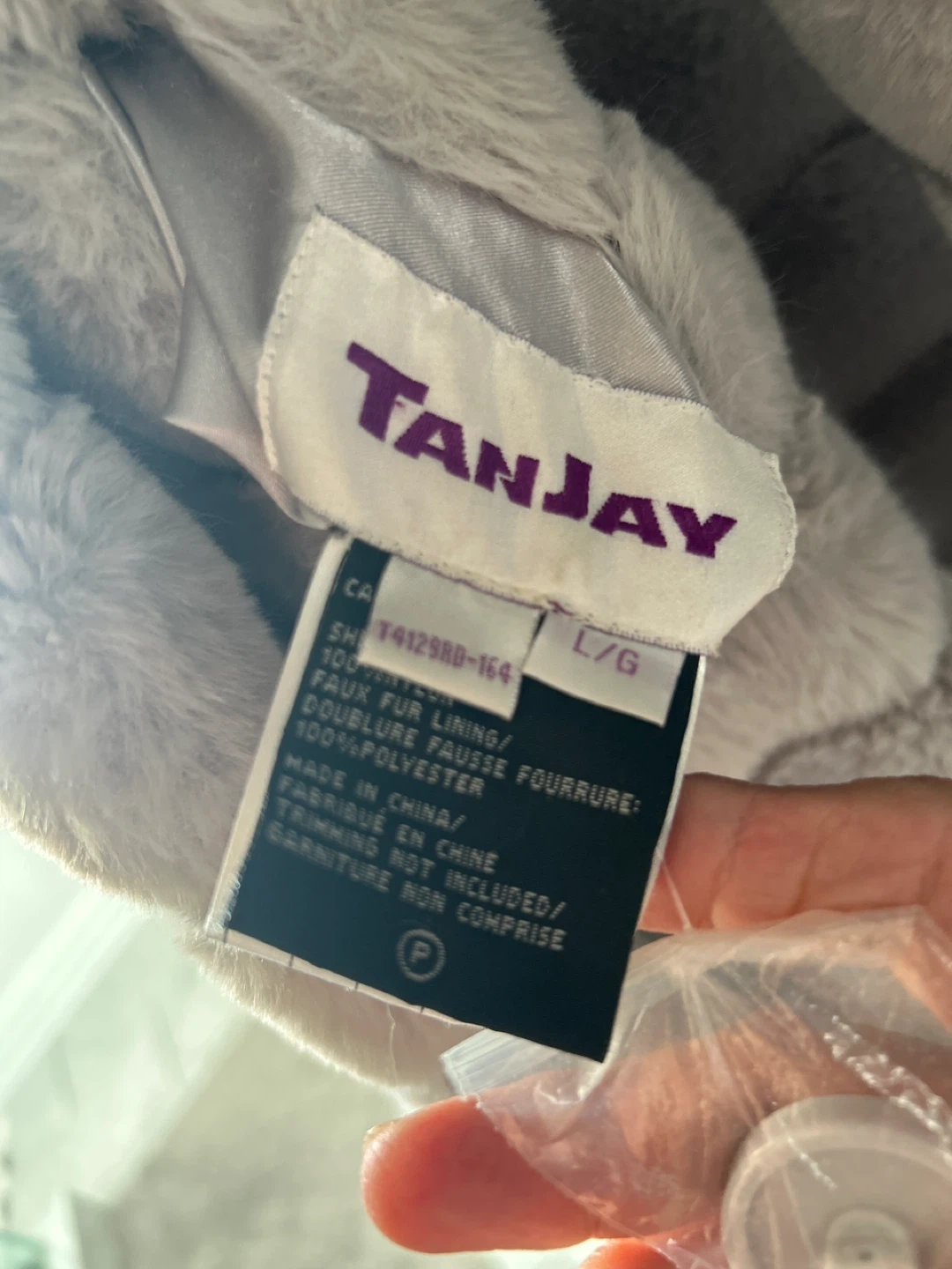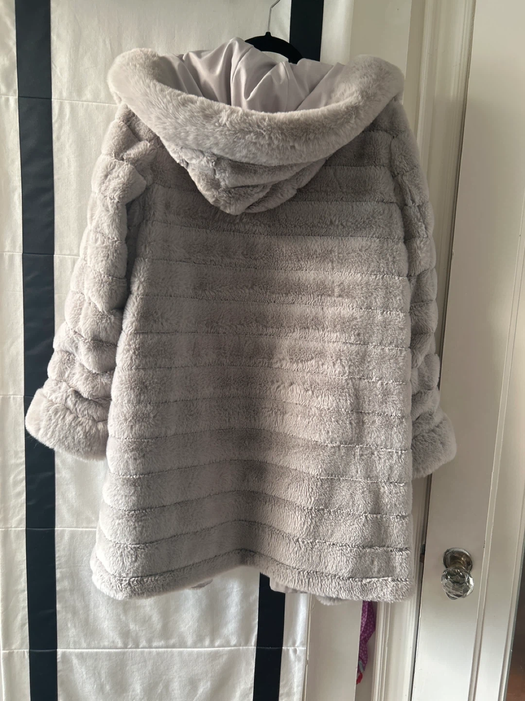 Selling a cozy Tanjay faux fur hooded coat in size L! it is reversible with a water resistant side, fully with buttons It's in great condition and perfect for keeping warm on chilly days. The coat features a soft faux fur lining and a stylish design. It's made of 100% polyester.