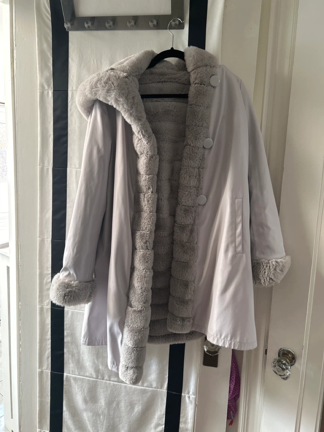 Selling a cozy Tanjay faux fur hooded coat in size L! it is reversible with a water resistant side, fully with buttons It's in great condition and perfect for keeping warm on chilly days. The coat features a soft faux fur lining and a stylish design. It's made of 100% polyester.