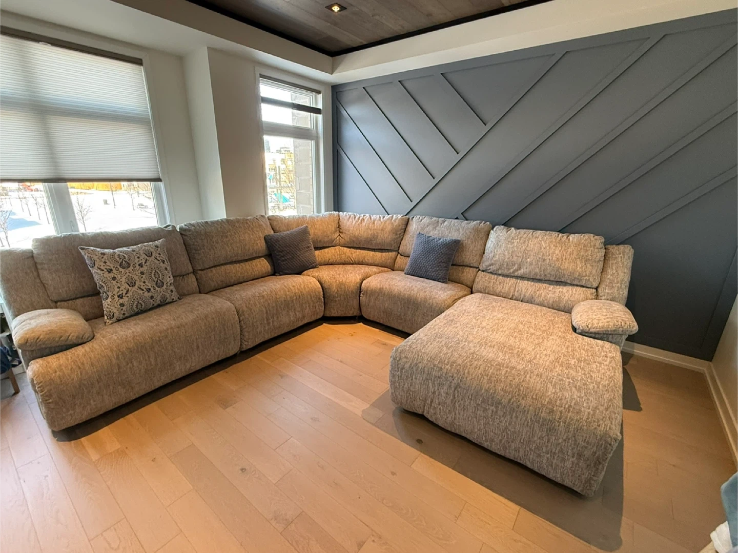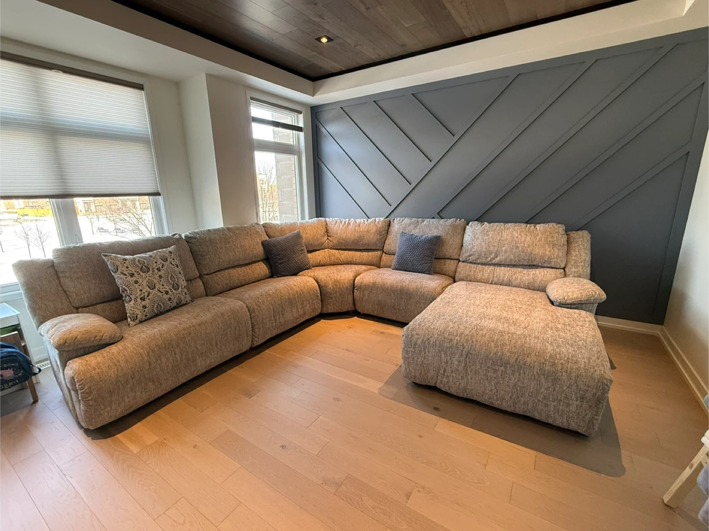 Comfortable sectional sofa with a chaise lounge. Upholstered in a textured, neutral fabric. Features plush cushions and adjustable headrests. Perfect for a large living room or family room!