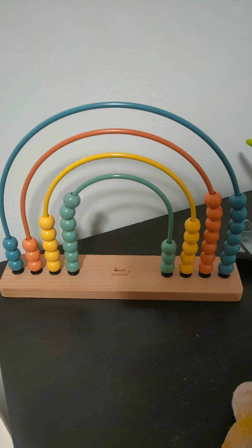 This is a colourful wooden rainbow abacus from Jumini. It has five rainbow arches with beads in blue, orange, yellow, green, and teal. The wooden base is smooth and sturdy. It's a fun toy for little ones to learn counting!