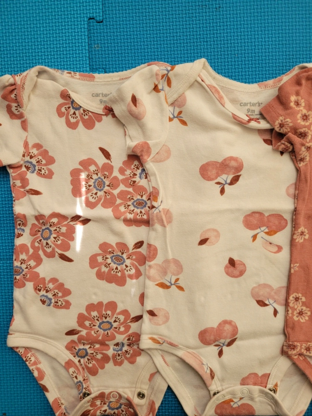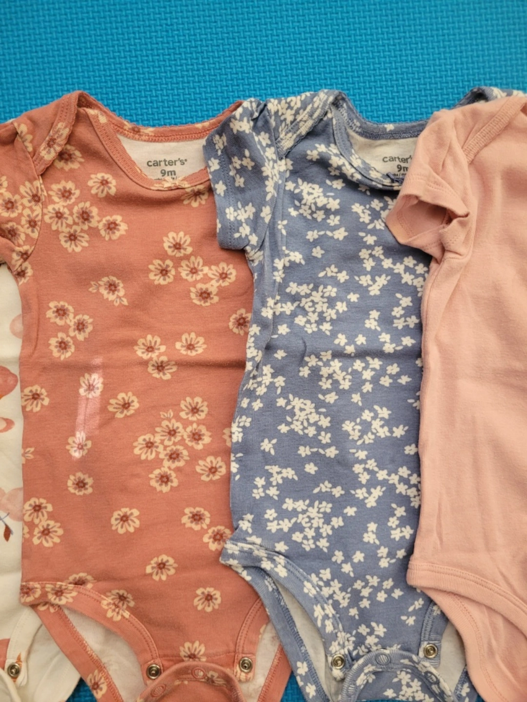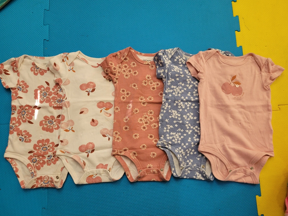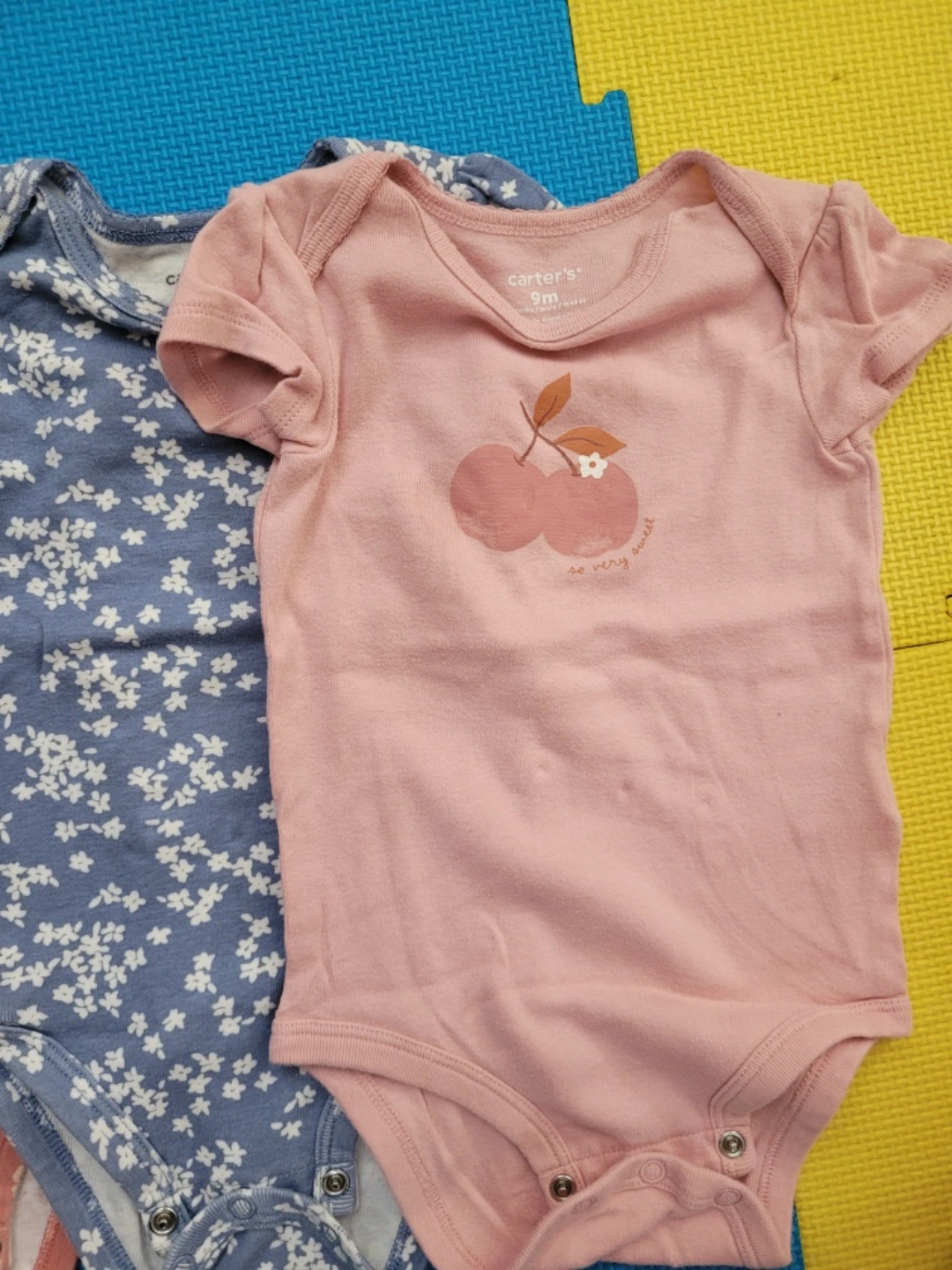 Here's a set of five Carter's baby bodysuits, size 9M! They're in excellent condition and feature cute floral and cherry patterns. Perfect for your little one!