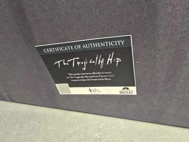 Own a piece of Canadian rock history with this framed Tragically Hip memorabilia, featuring a silver record and iconic band photos. This piece is in good condition, with dimensions of approximately 40 inches in height and 32 inches in width, ready to hang and display proudly. It includes a certificate of authenticity from Frameworth Music. The item is pre-owned, adding to its vintage charm. Framed with silver record, includes band photos, Certificate of Authenticity. Dimensions: Approximately 40" x 32". Based on similar Tragically Hip memorabilia, a fair price would be around $450 CAD. If you're reading this, yes, it's still available!