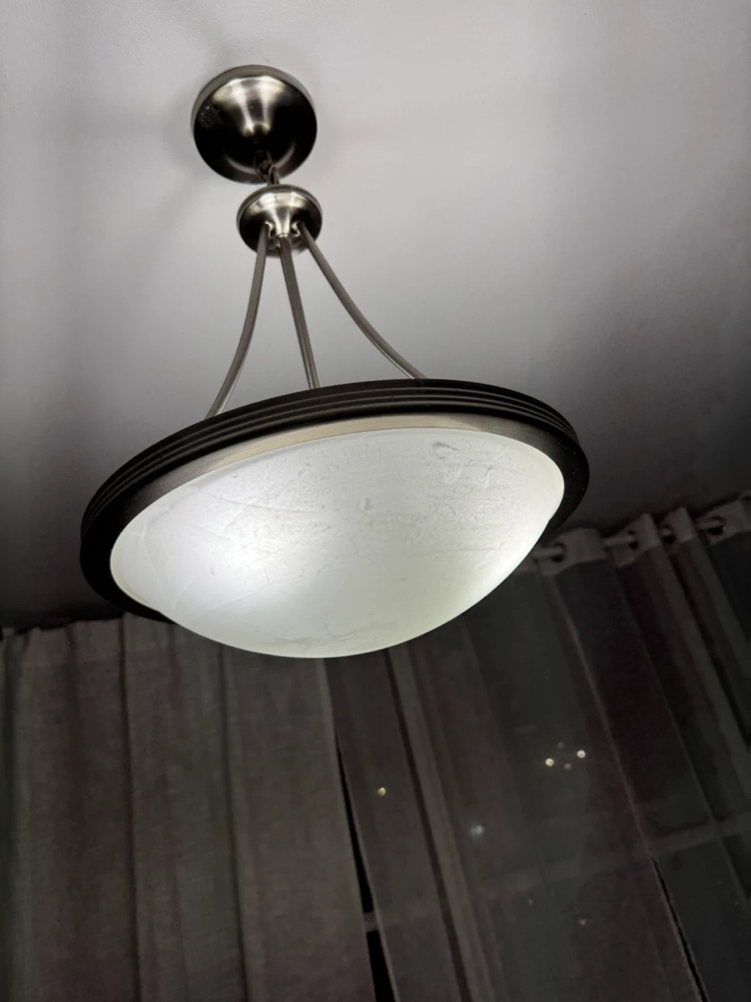 A drum pendant light fixture with a satin nickel finish. It has a frosted glass shade that provides diffused lighting. It's a lovely addition to any room, offering a warm glow. When might someone use this? It's great for overhead lighting in hallways or dining areas.