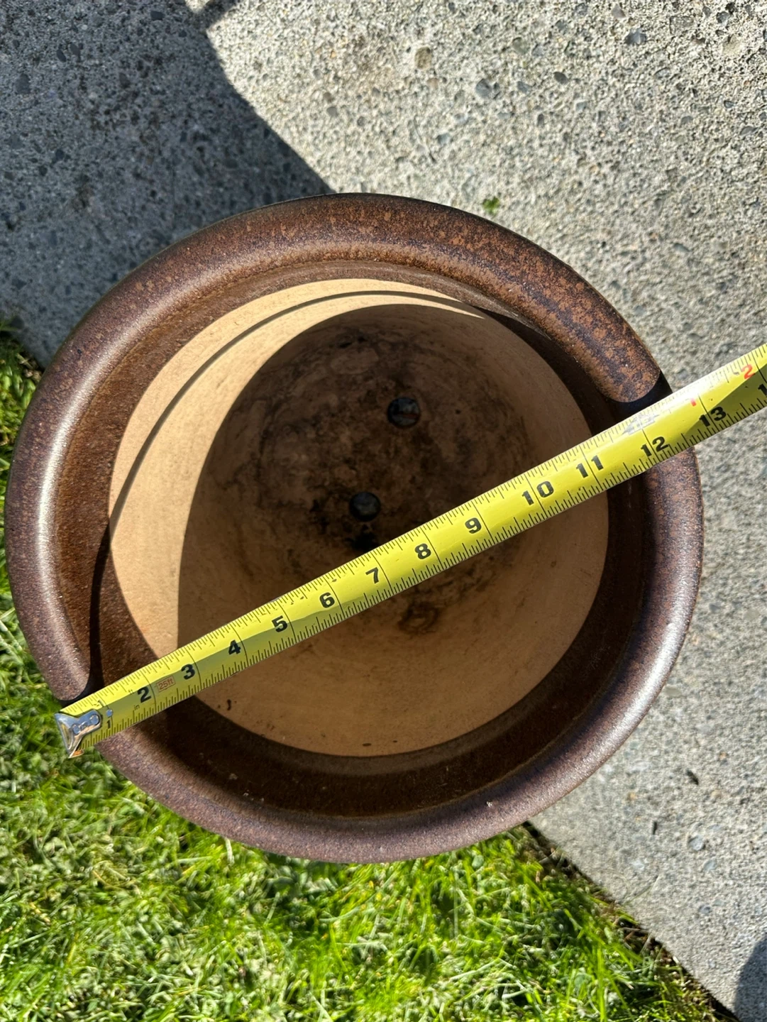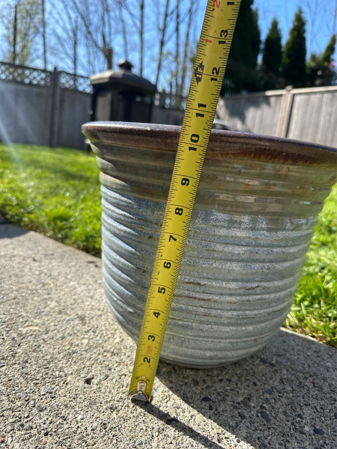 This is a ceramic plant pot with a rustic brown and blue glaze. It measures approximately 9 inches in height and 8.5 inches in diameter at the opening. There are drainage holes in the bottom.