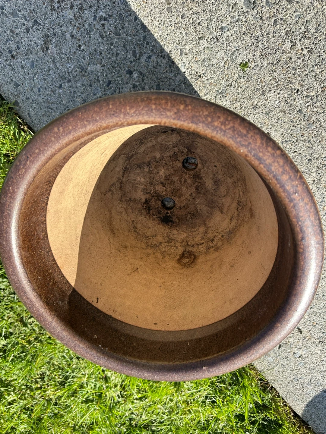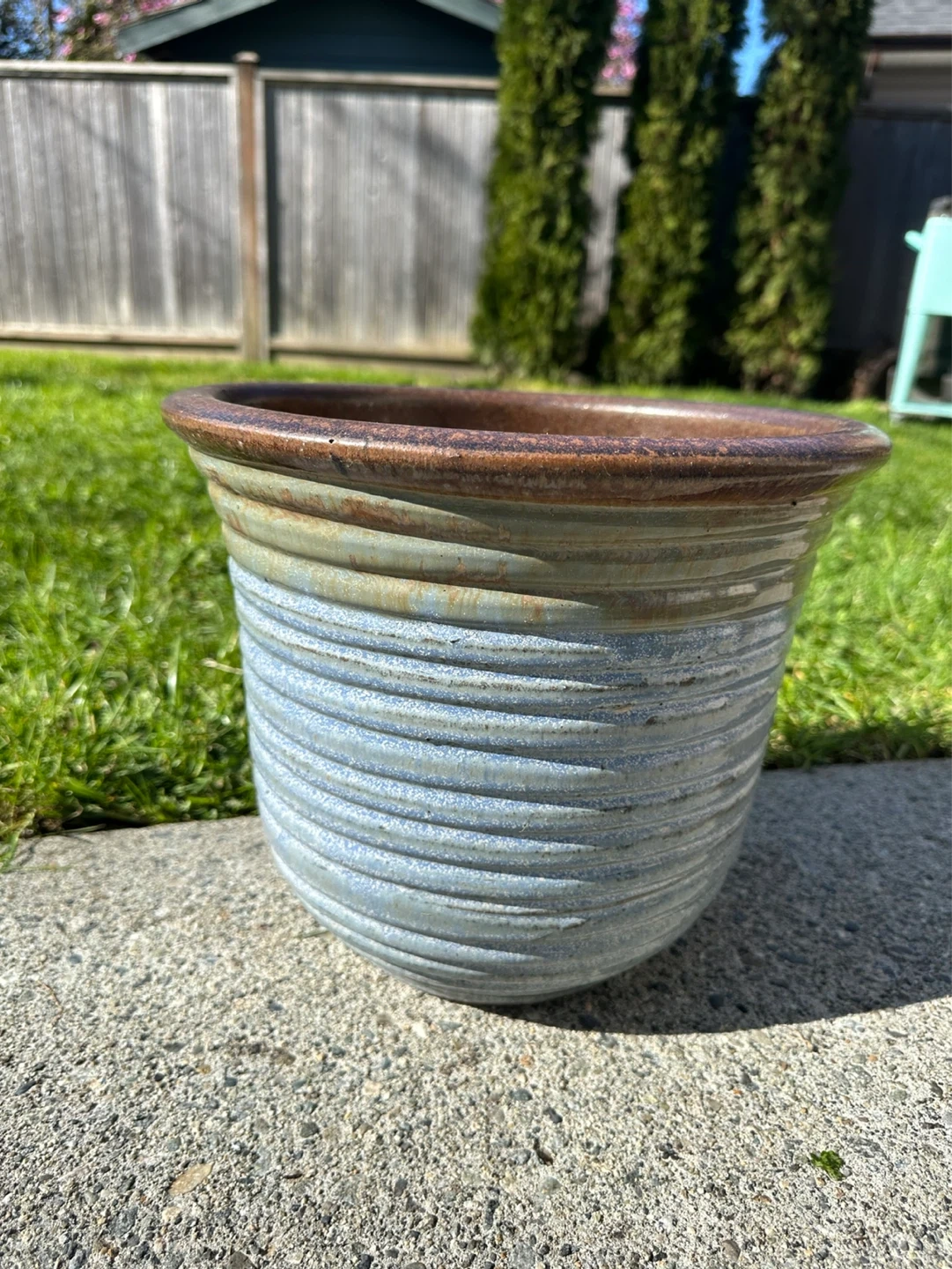 This is a ceramic plant pot with a rustic brown and blue glaze. It measures approximately 9 inches in height and 8.5 inches in diameter at the opening. There are drainage holes in the bottom.
