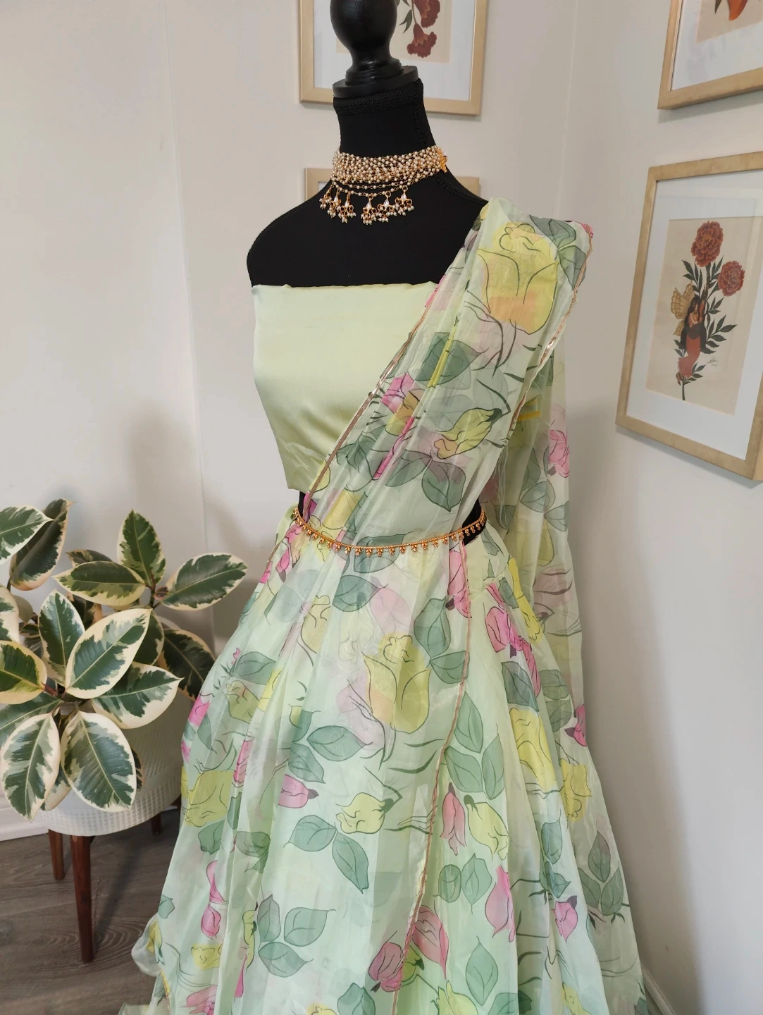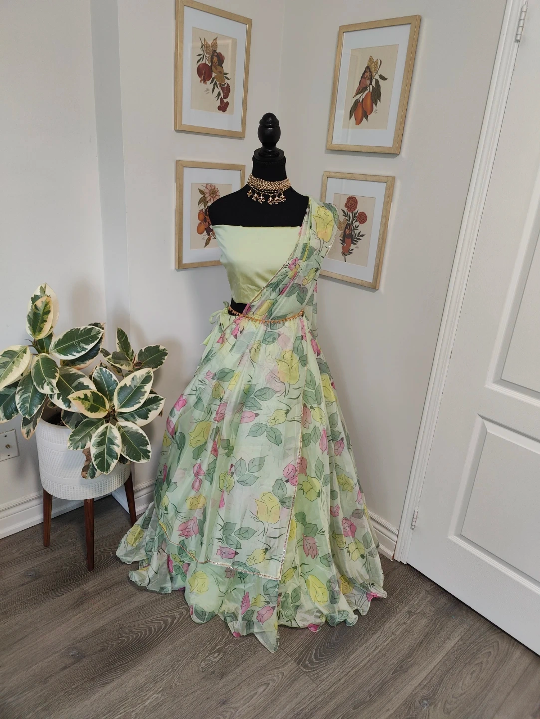 Light green floral print lehenga choli set with a matching dupatta. The fabric is lightweight and flowy, perfect for festive occasions. This outfit features a unstitch blouse and a long skirt with a beautiful floral design. It's a stunning choice for cultural events or parties!