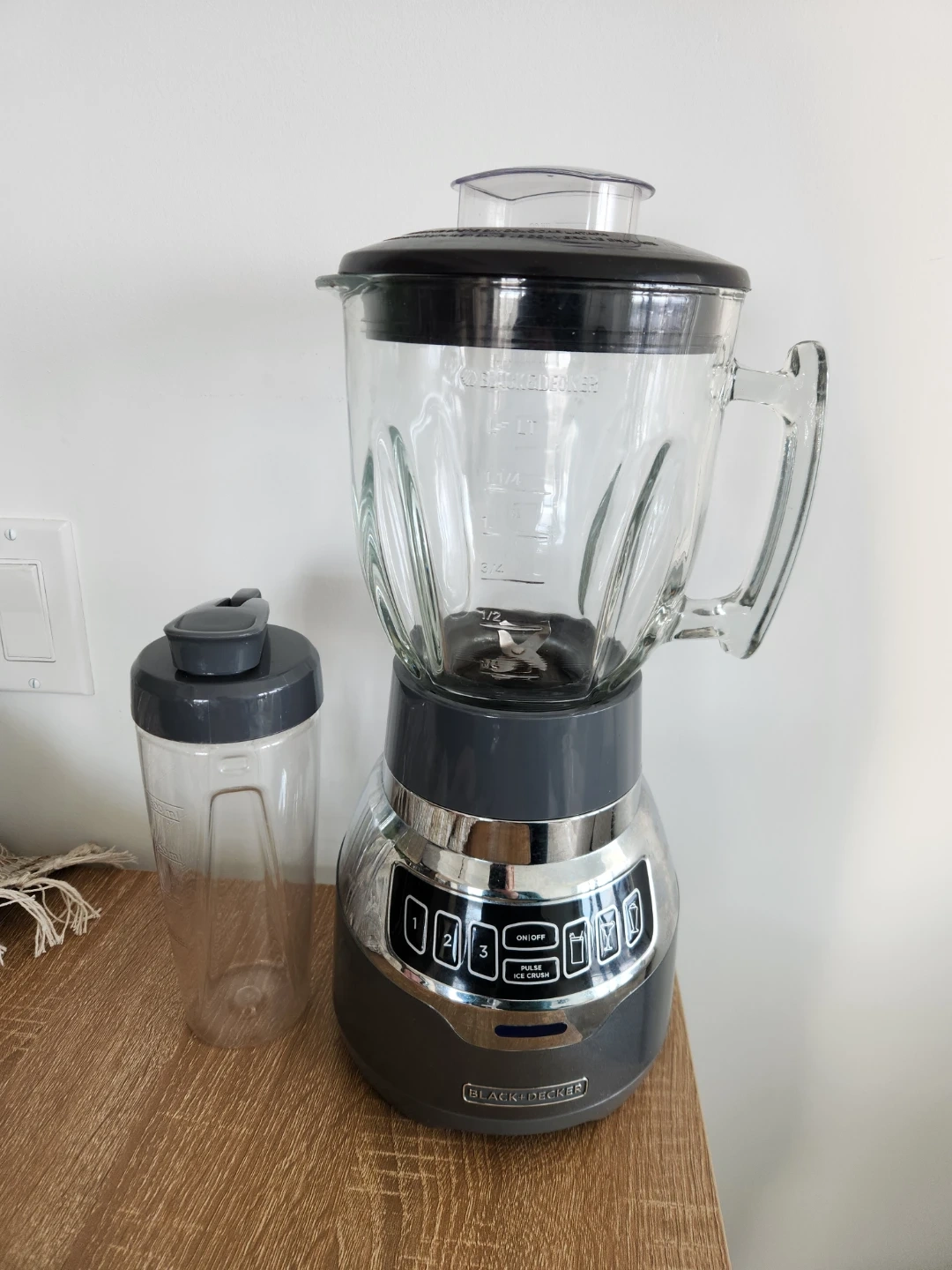Black+Decker blender with a glass jar and a personal travel cup that can be used directly with the blender to prepare a smoothie or a shake and take your drink with you. The blender has multiple speed settings and a pulse function. Lightly used, so it's in perfect condition. Moving sale.