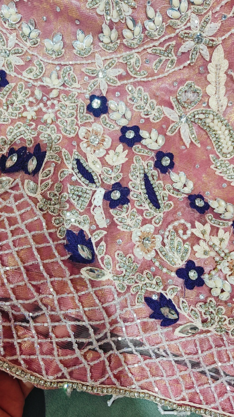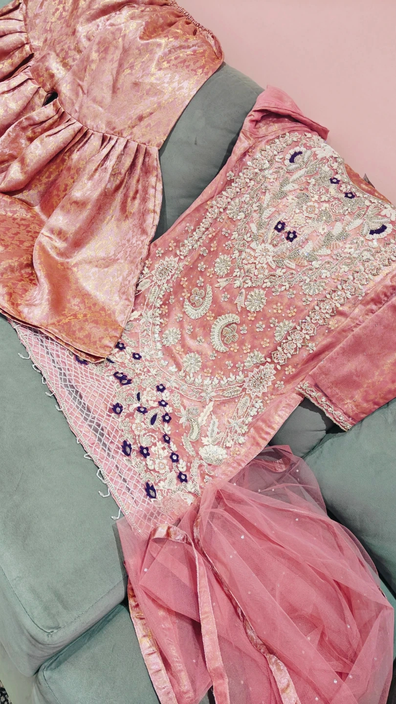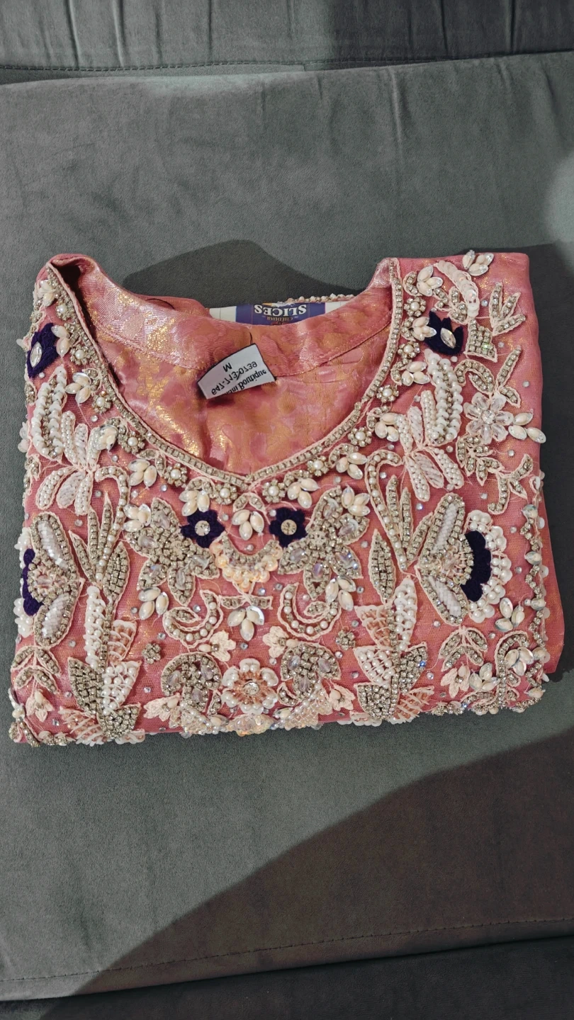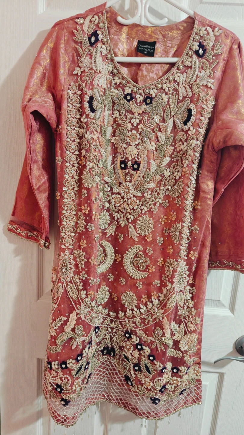 Beautiful pink kurti, garara, and dupatta set. Intricately embellished with beads and sequins. Perfect for special occasions!