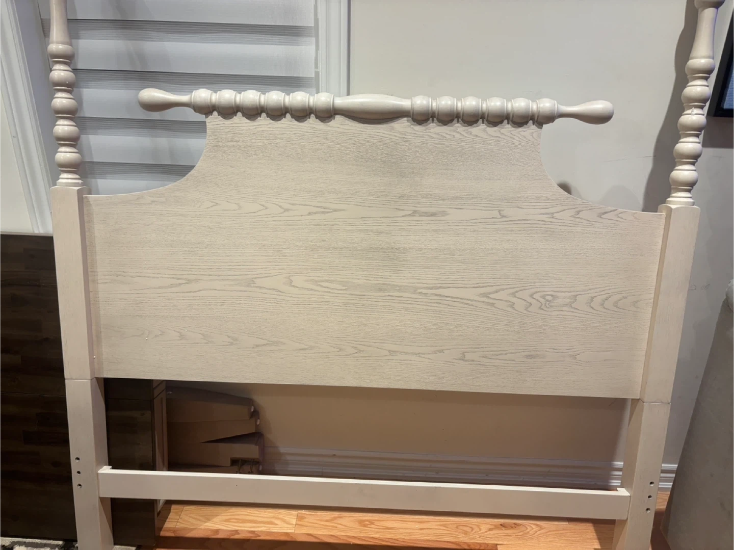 This light wash Antique wooden headboard features a classic spindle design. It's made from wood with a visible grain. Perfect for updating your bedroom's look! Available for pickup and delivery