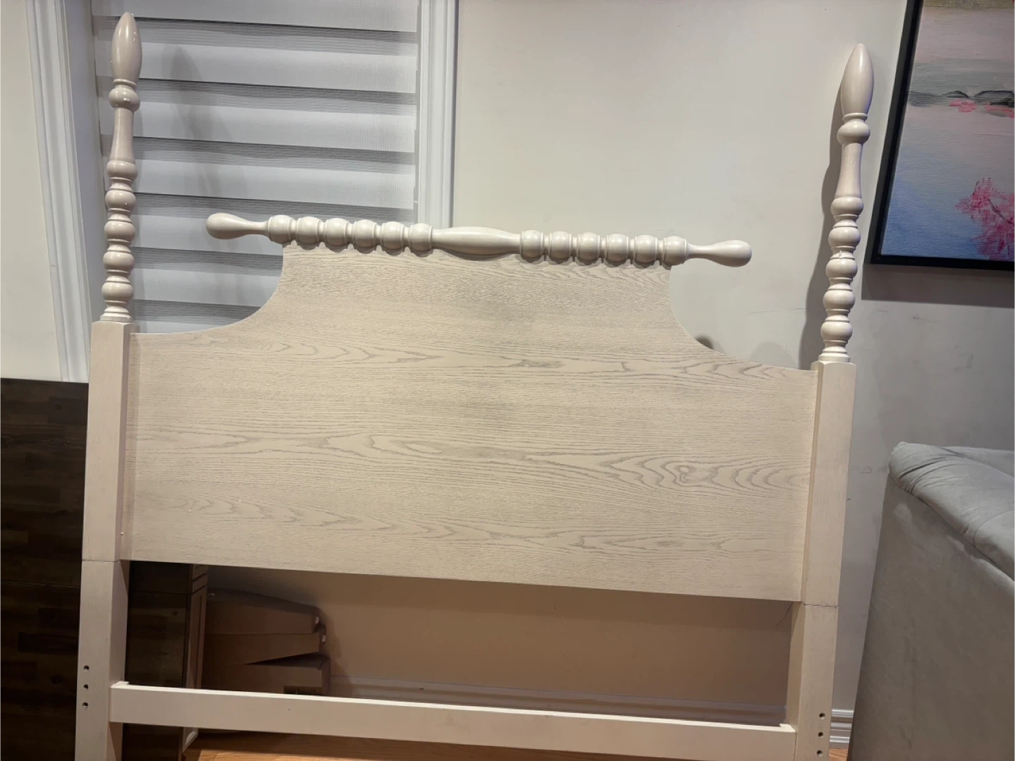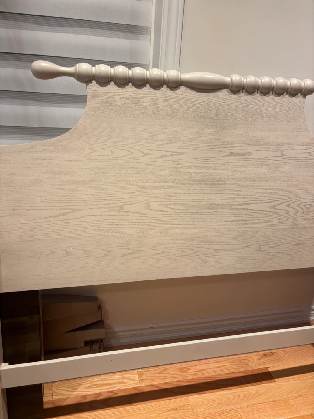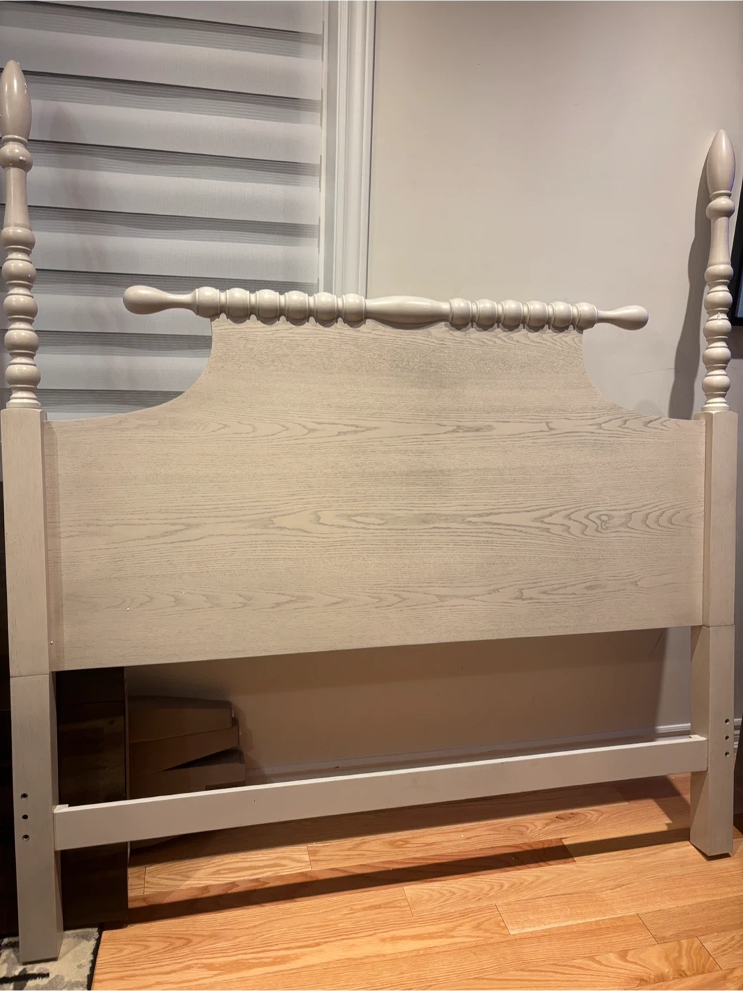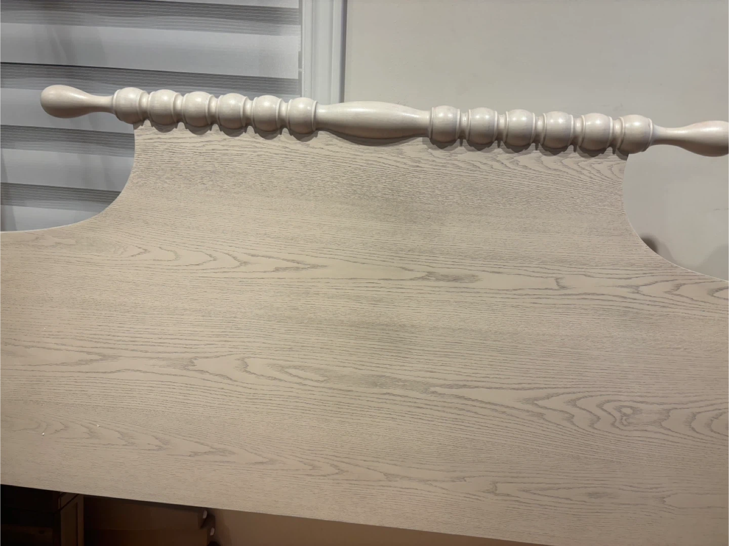 This light wash Antique wooden headboard features a classic spindle design. It's made from wood with a visible grain. Perfect for updating your bedroom's look! Available for pickup and delivery