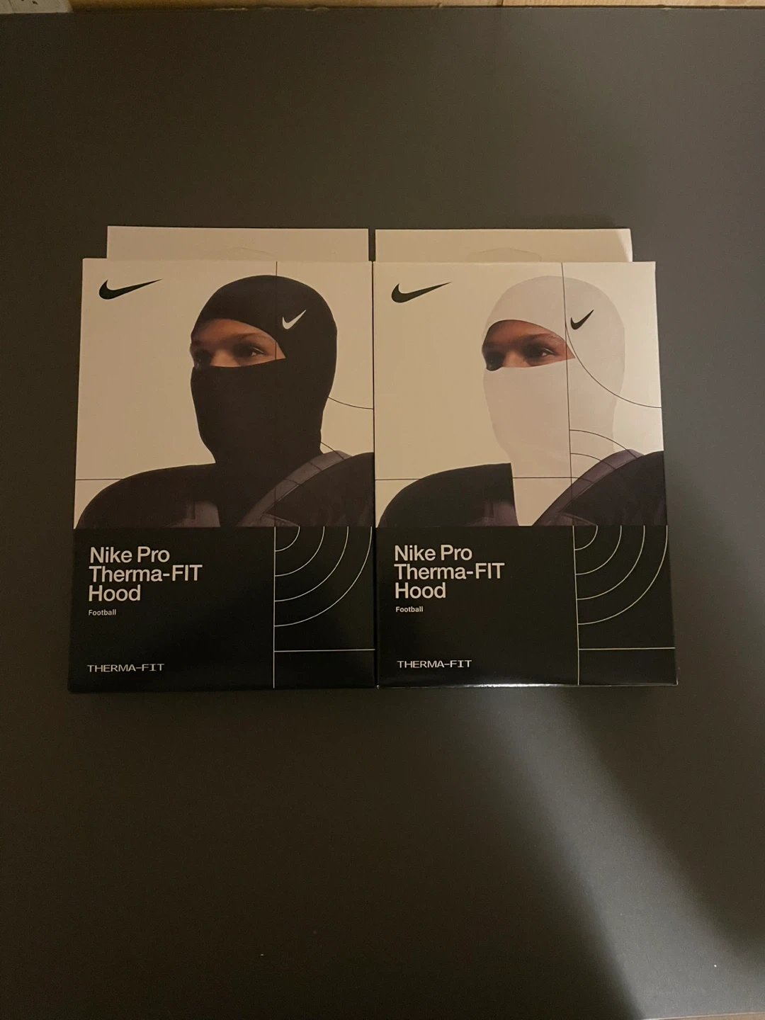 Two Nike Pro Therma-FIT Hoods for football, one black and one white. They're designed for performance and warmth during play.