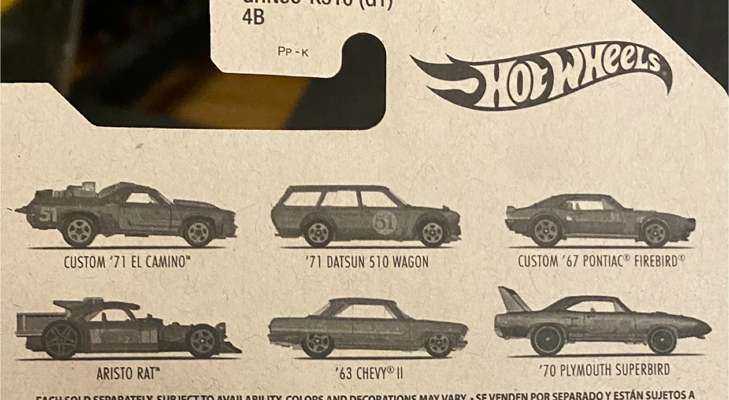 This is a set of six Hot Wheels diecast cars from the Collectors series. Custom '71 El Camino, '71 Datsun 510 Wagon, Custom '67 Pontiac Firebird, Aristo Rat, '63 Chevy II, and '70 Plymouth Superbird.