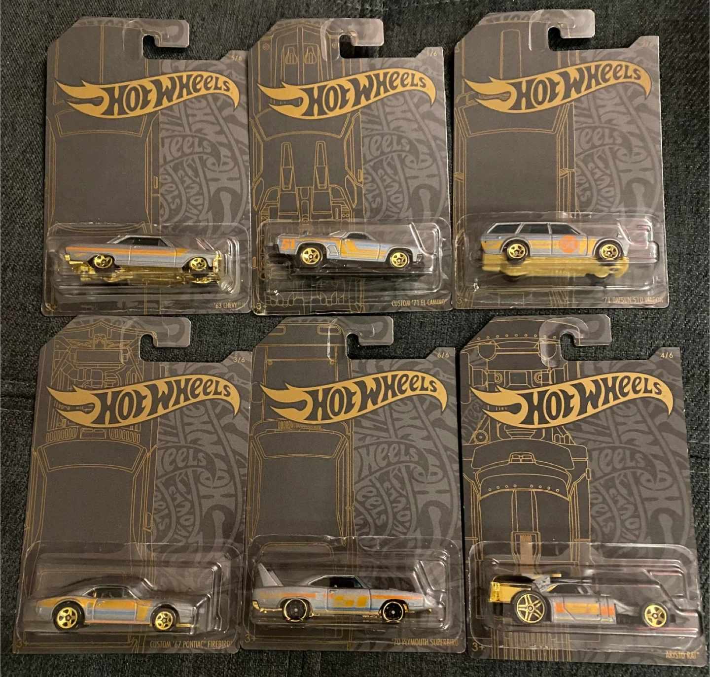 This is a set of six Hot Wheels diecast cars from the Collectors series. Custom '71 El Camino, '71 Datsun 510 Wagon, Custom '67 Pontiac Firebird, Aristo Rat, '63 Chevy II, and '70 Plymouth Superbird.