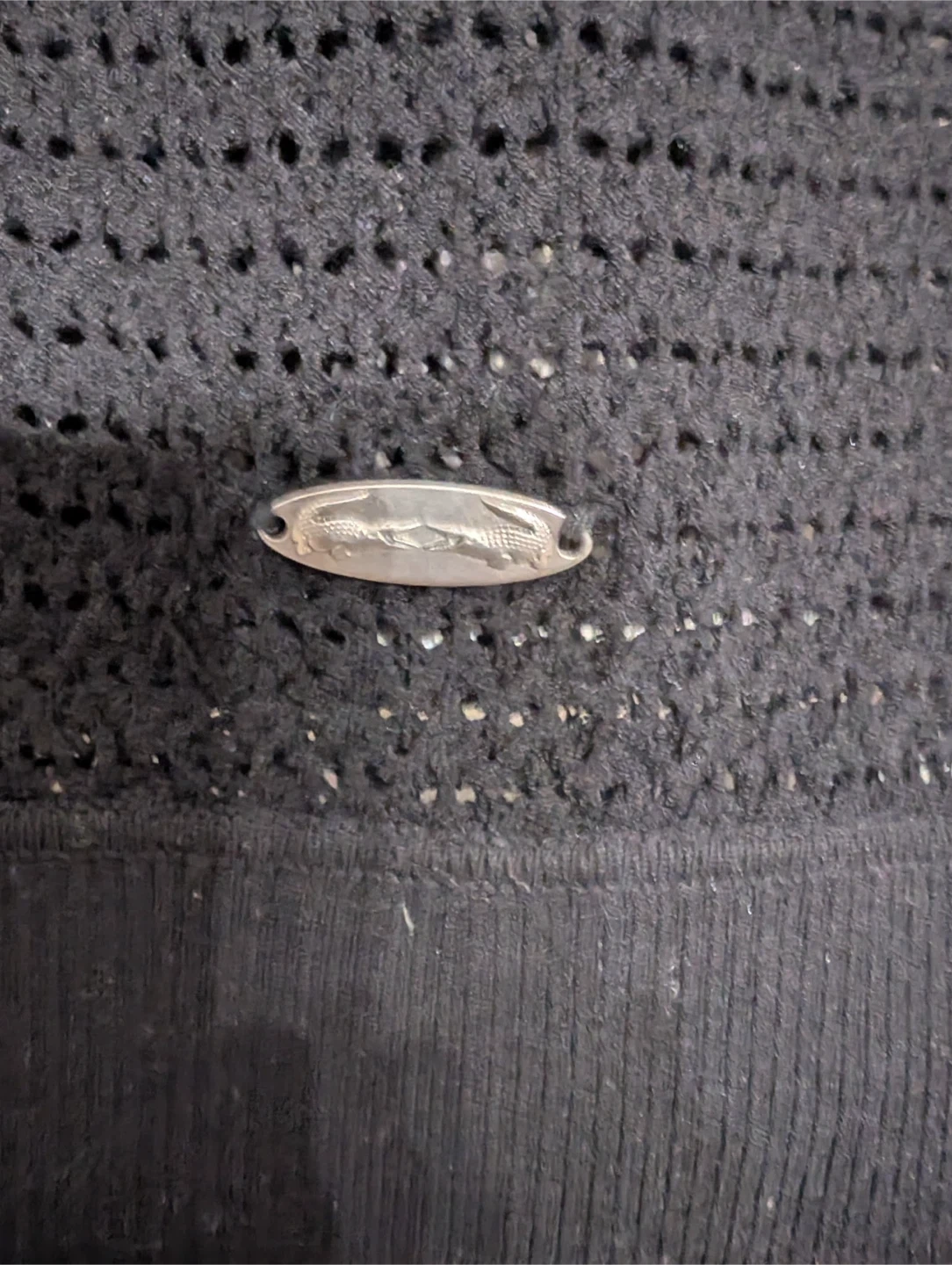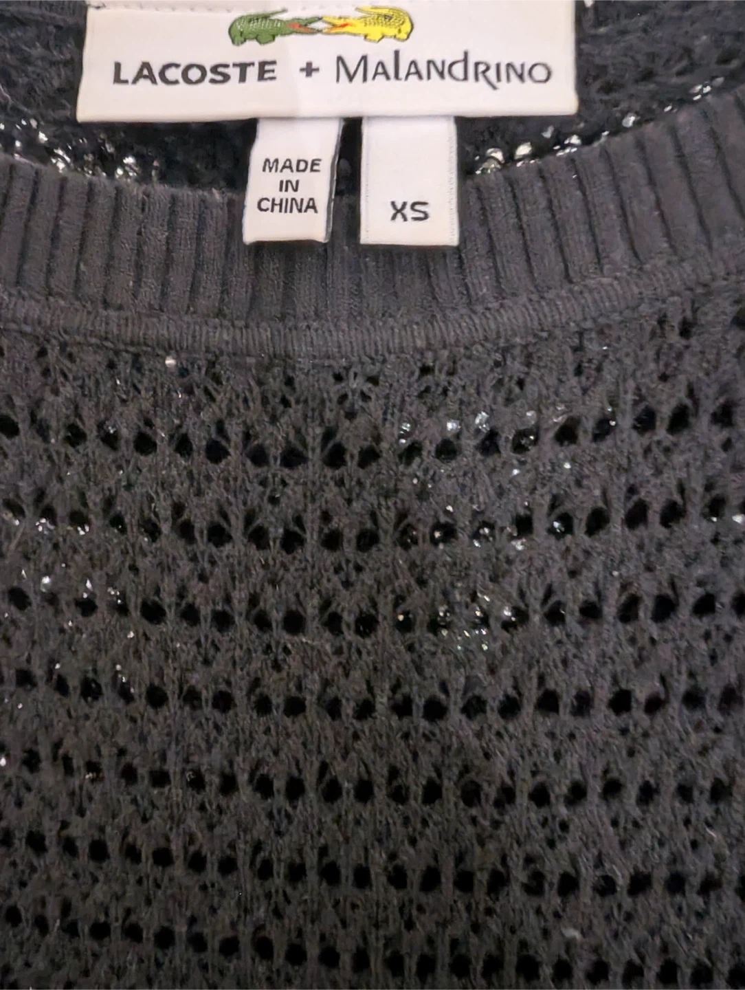 This is a black knit dress from Lacoste and Malandrino. It's a size XS and made in China. The dress features a unique open-knit pattern.
