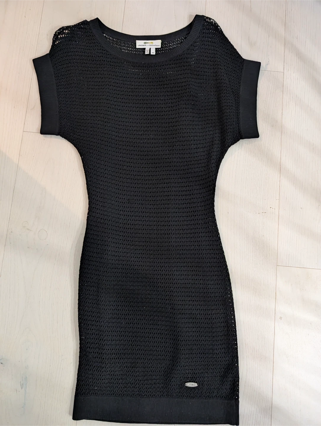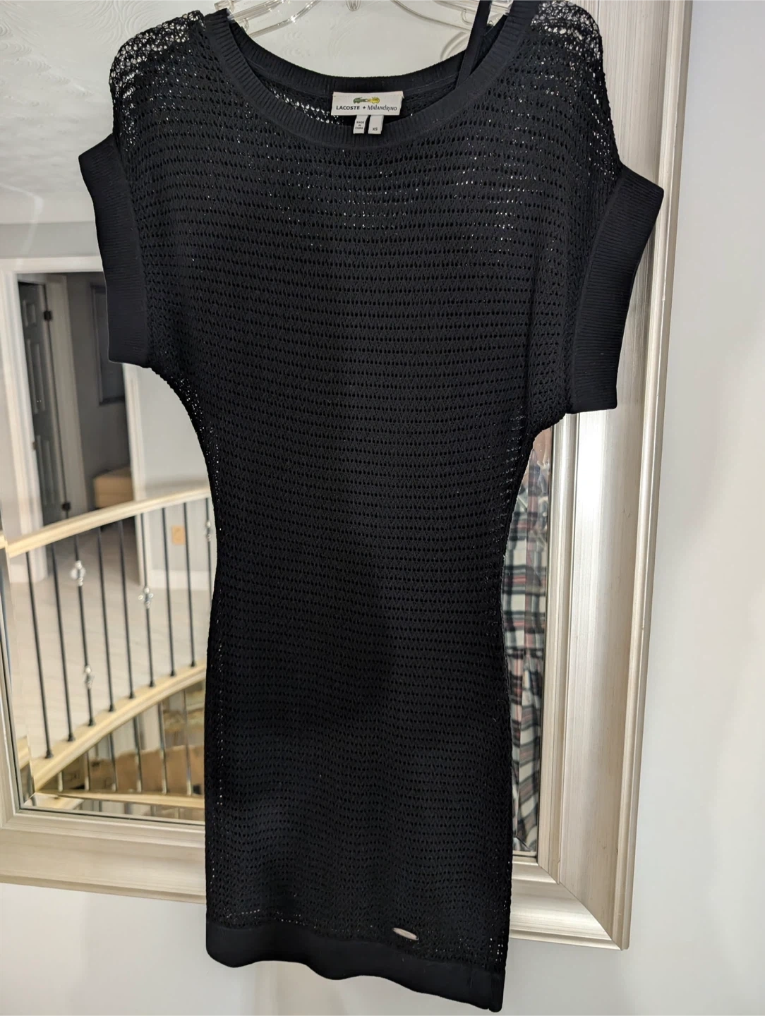 This is a black knit dress from Lacoste and Malandrino. It's a size XS and made in China. The dress features a unique open-knit pattern.
