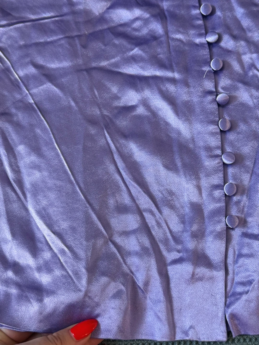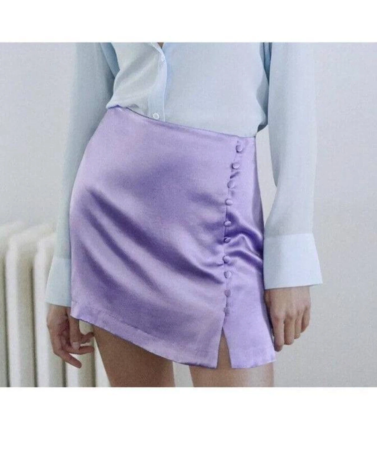 Lavender mini skirt made from viscose fabric that subtly shimmers in the light. Decorated with a row of buttons on the side. It has a very feminine fit that highlights the waist. A perfect option for summer or an evening look.