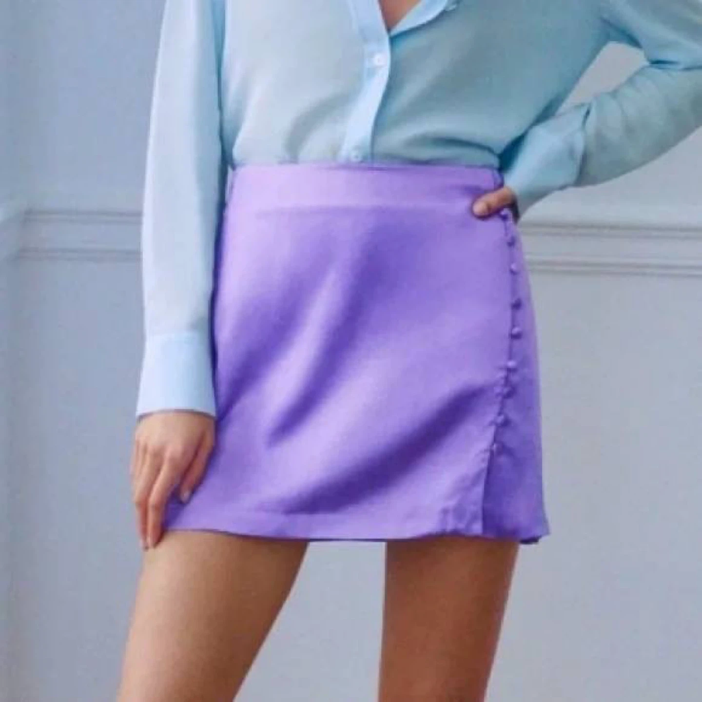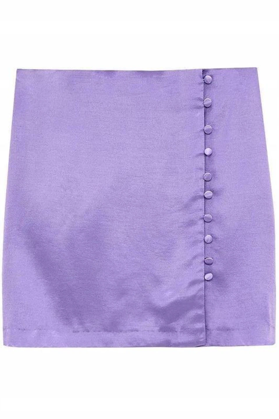 Lavender mini skirt made from viscose fabric that subtly shimmers in the light. Decorated with a row of buttons on the side. It has a very feminine fit that highlights the waist. A perfect option for summer or an evening look.