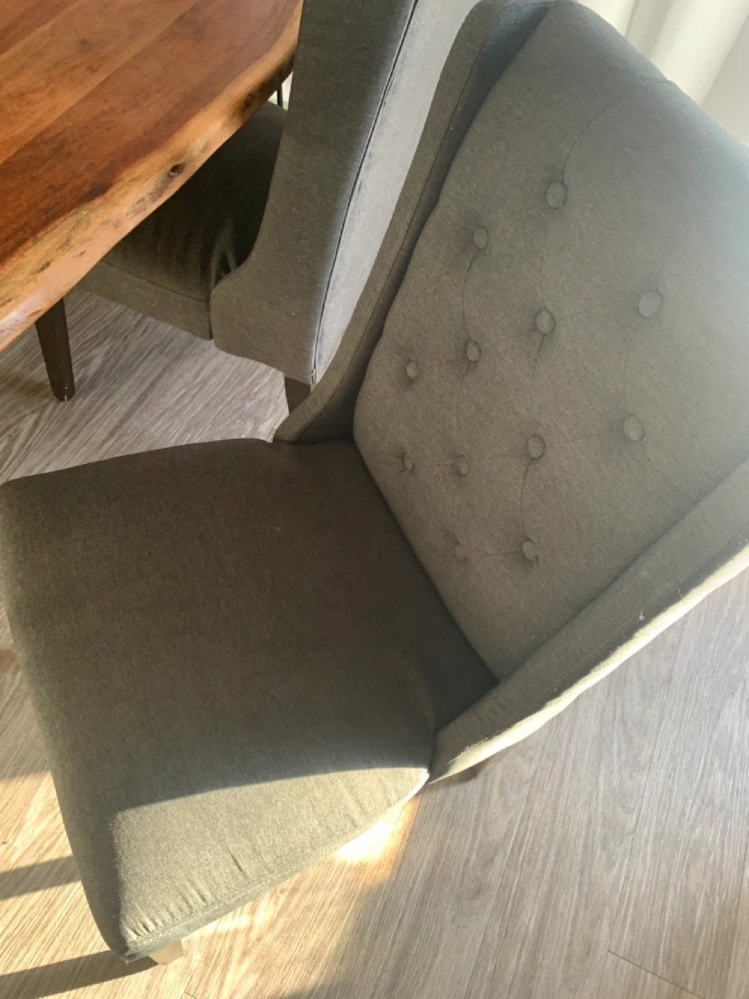 Beautiful live edge dining table with two upholstered chairs and a bench seat. The table features a natural wood top with a live edge finish and metal hairpin legs. Chairs and bench are upholstered in a dark grey fabric with tufted detailing.