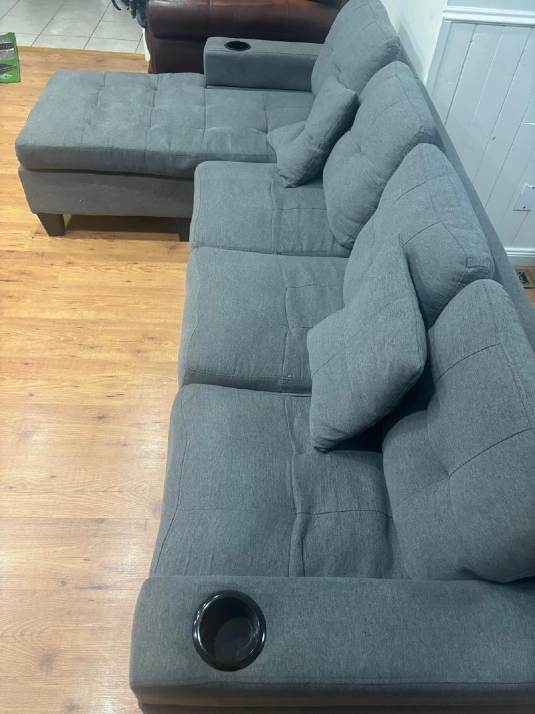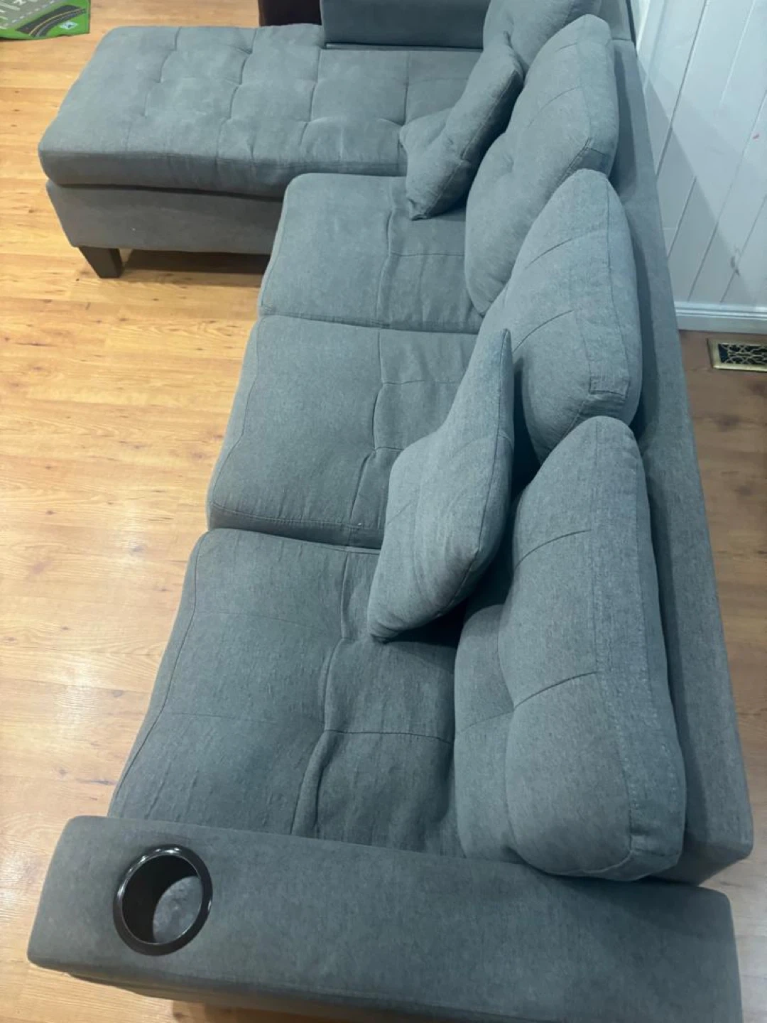 Grey fabric sectional sofa with a chaise. Includes multiple throw pillows and built-in cupholders. Tufted seat cushions and backrests add a touch of style. This comfy sofa is great for relaxing!