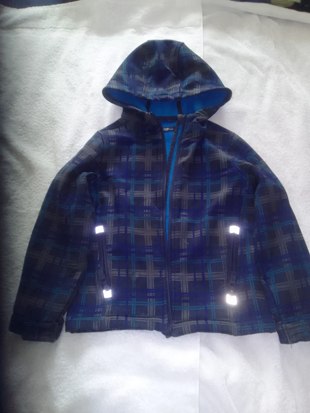 Fleece-lined softshell jacket for kids. Features a full zip front and a hood. Reflective details on the front and back for visibility. Durable and comfortable for outdoor activities.