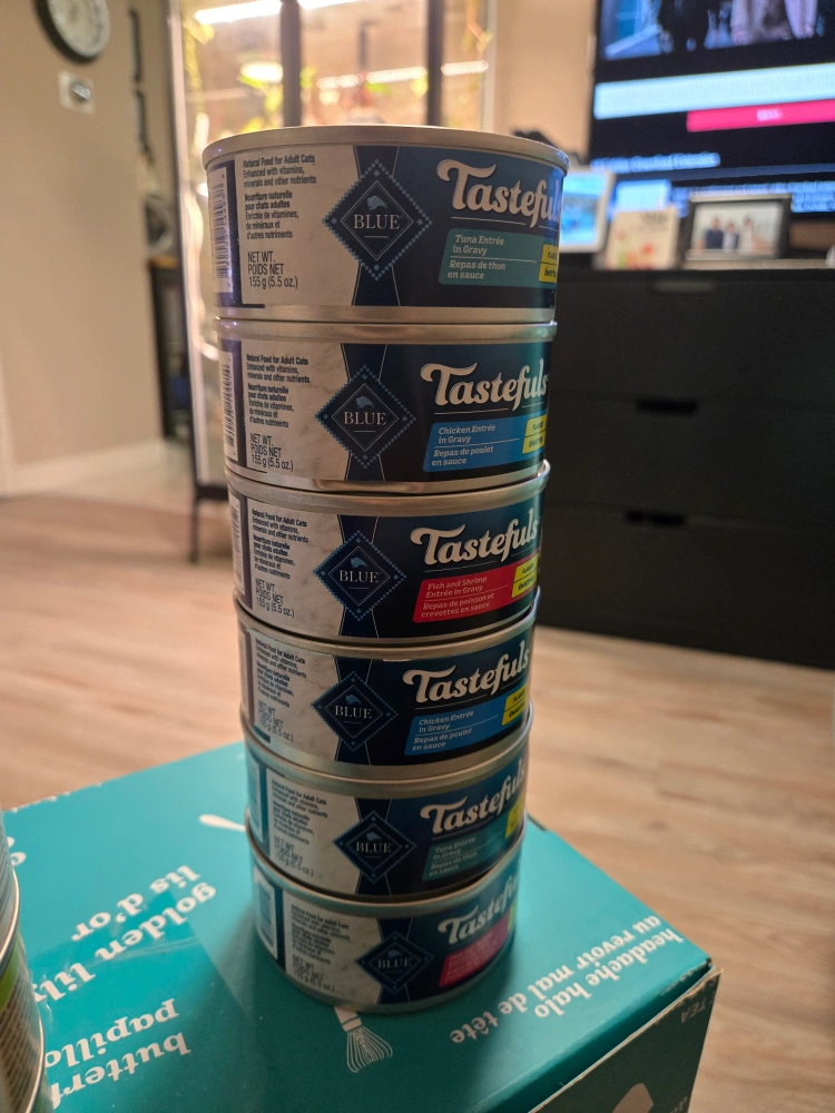 Large quantity of wet cat food. Mix of Blue Tastefuls and Friskies Pate. Various flavours. Perfect for multi-cat households or those who want a large supply.