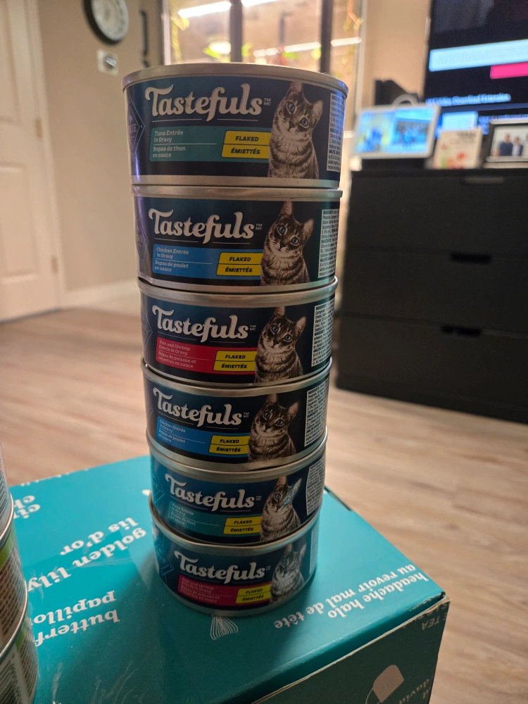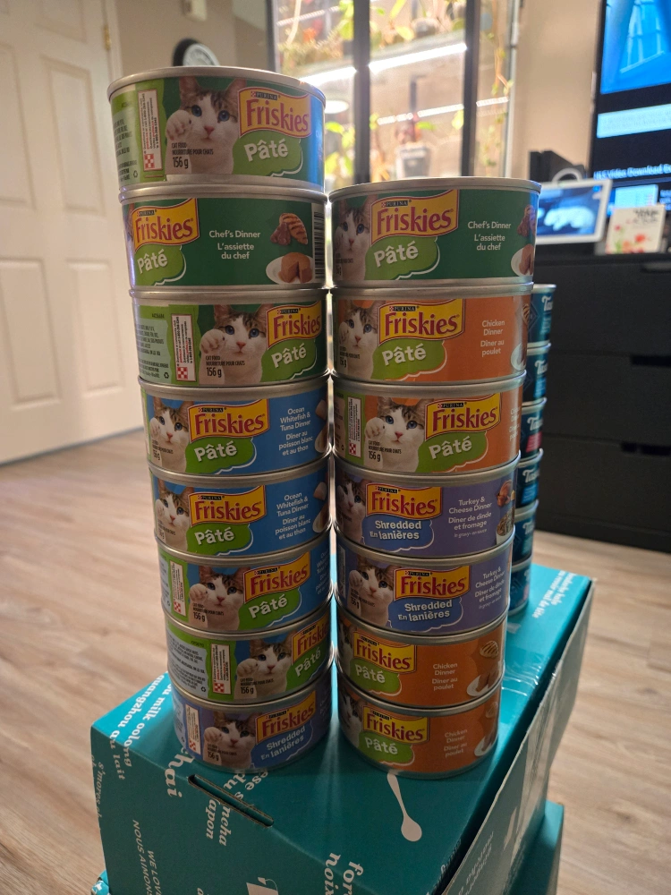 Large quantity of wet cat food. Mix of Blue Tastefuls and Friskies Pate. Various flavours. Perfect for multi-cat households or those who want a large supply.