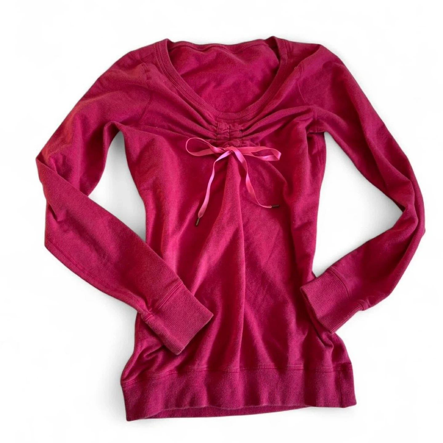 This Lululemon long sleeve shirt is a vibrant pink colour. It features a ruched front with a decorative ribbon tie. Made from a comfortable blend, it's perfect for active wear or casual outings.