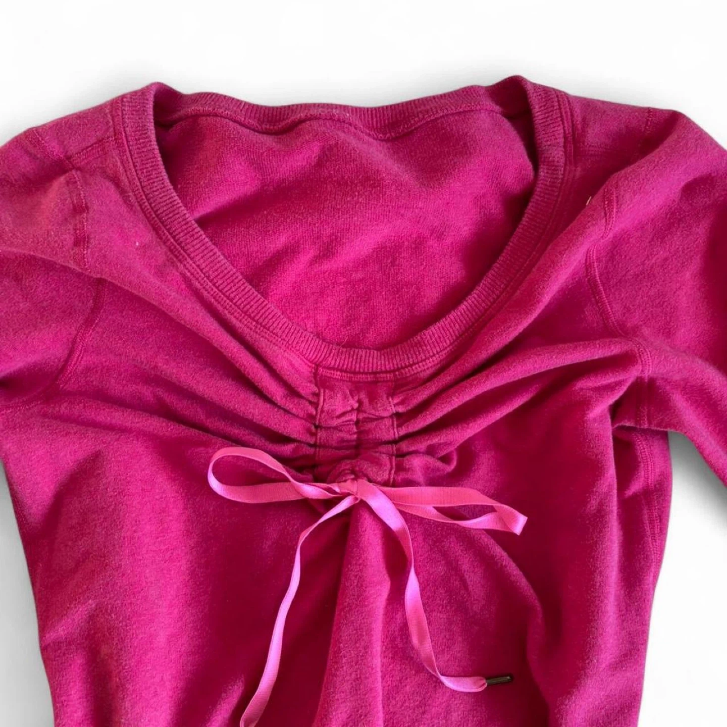 This Lululemon long sleeve shirt is a vibrant pink colour. It features a ruched front with a decorative ribbon tie. Made from a comfortable blend, it's perfect for active wear or casual outings.