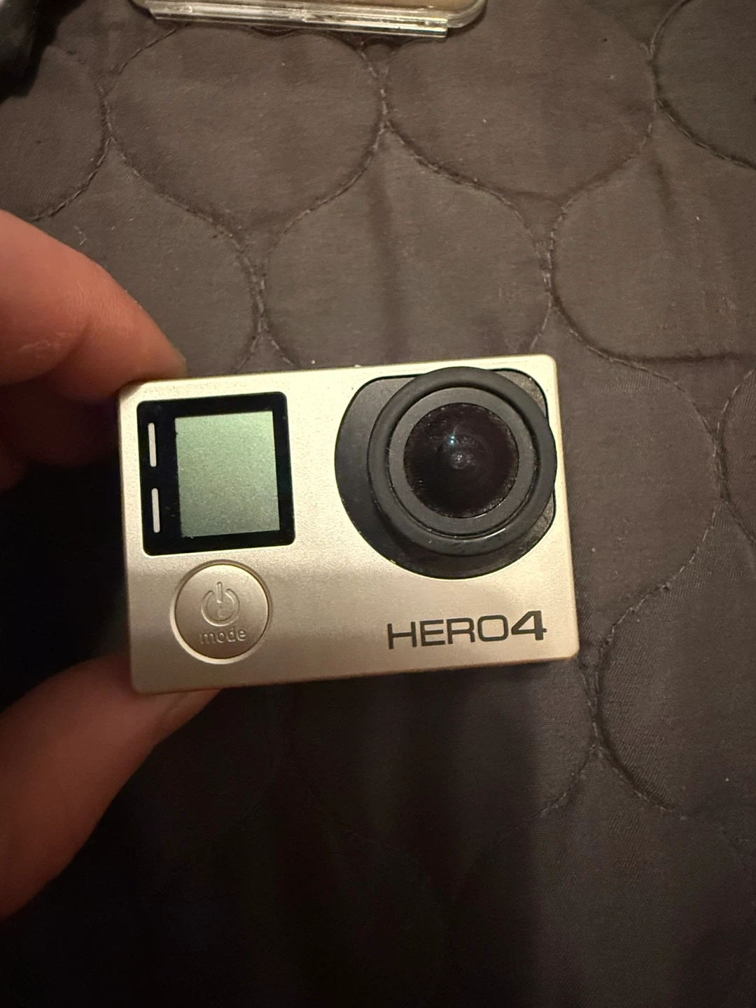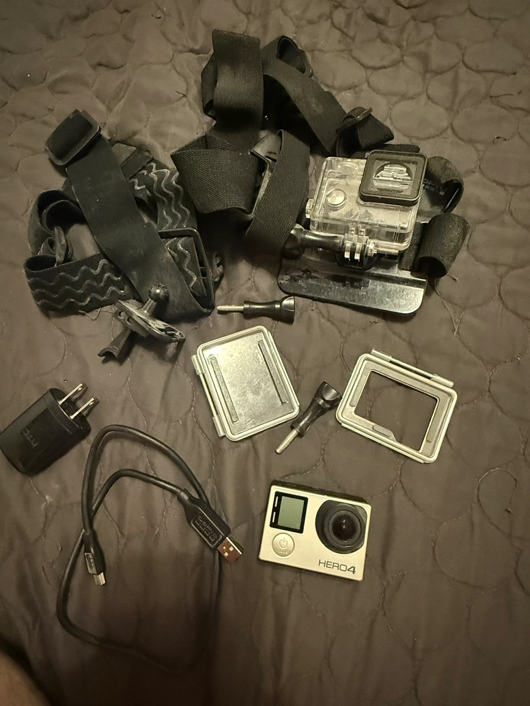 Selling a GoPro HERO4 camera bundle. It's silver and includes various mounting accessories, a charging cable, and a wall adapter. This camera is great for capturing action shots!