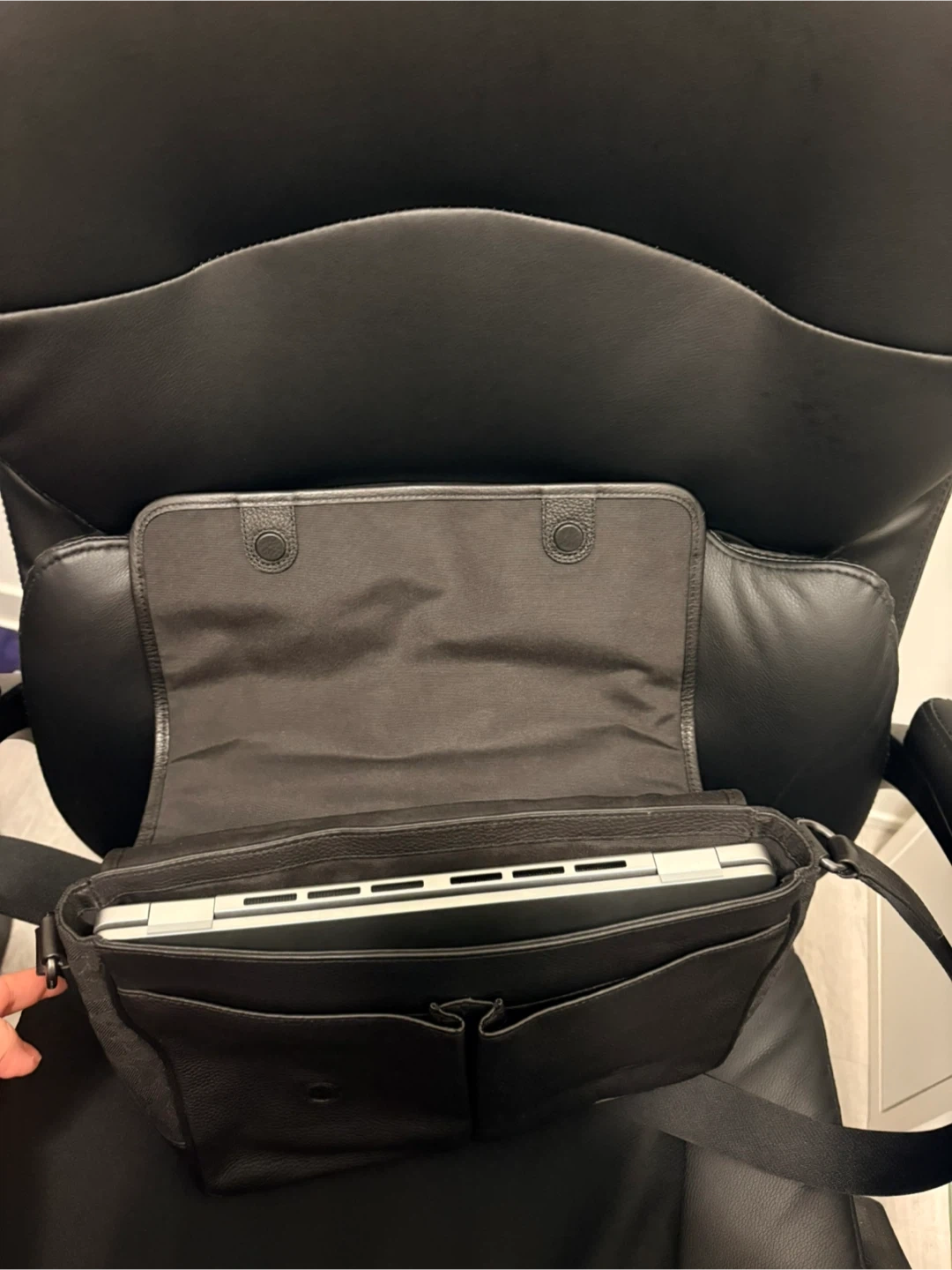 A black satchel with vertical stripes in beige, white, and tan. It has a durable canvas exterior and leather trim. Features an adjustable shoulder strap for comfort.