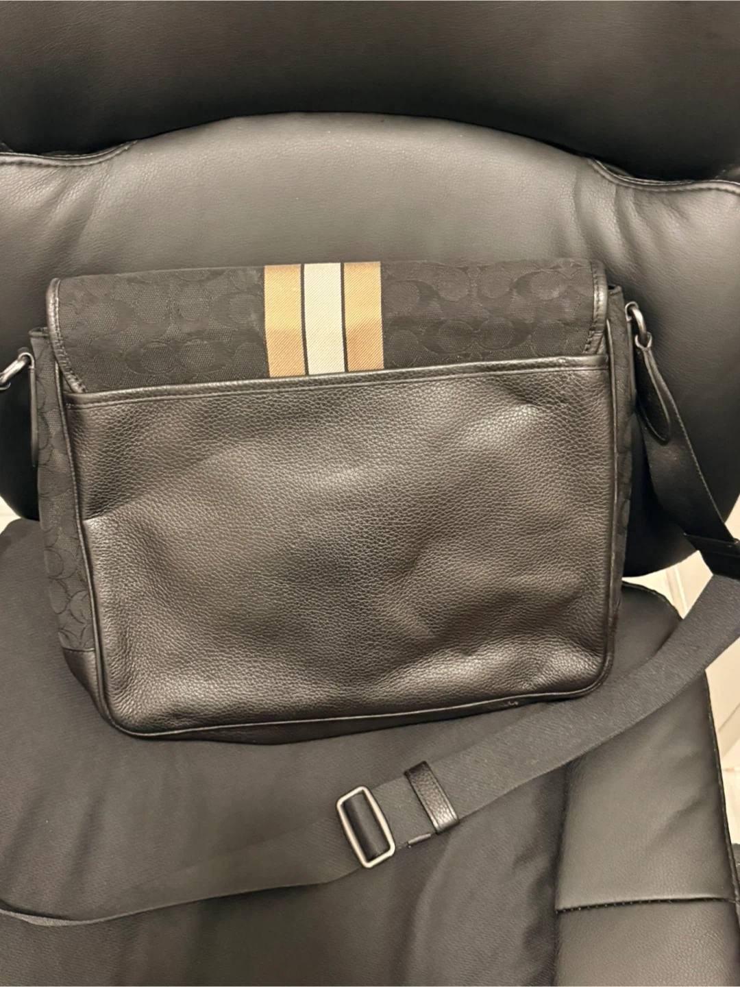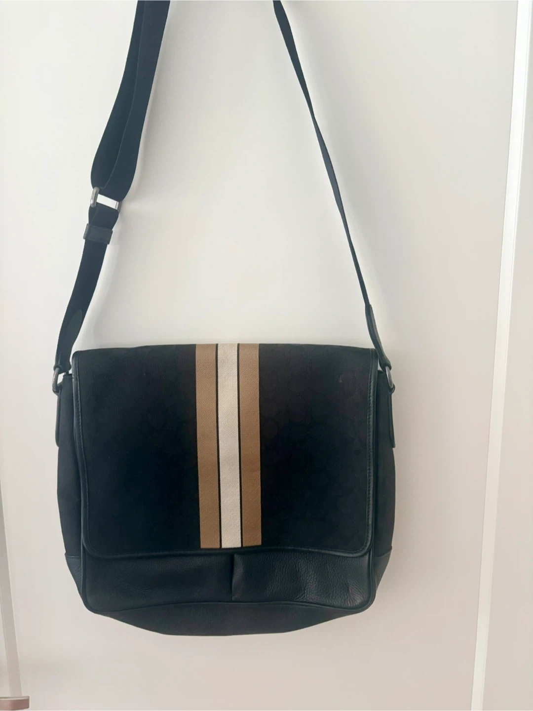 A black satchel with vertical stripes in beige, white, and tan. It has a durable canvas exterior and leather trim. Features an adjustable shoulder strap for comfort.