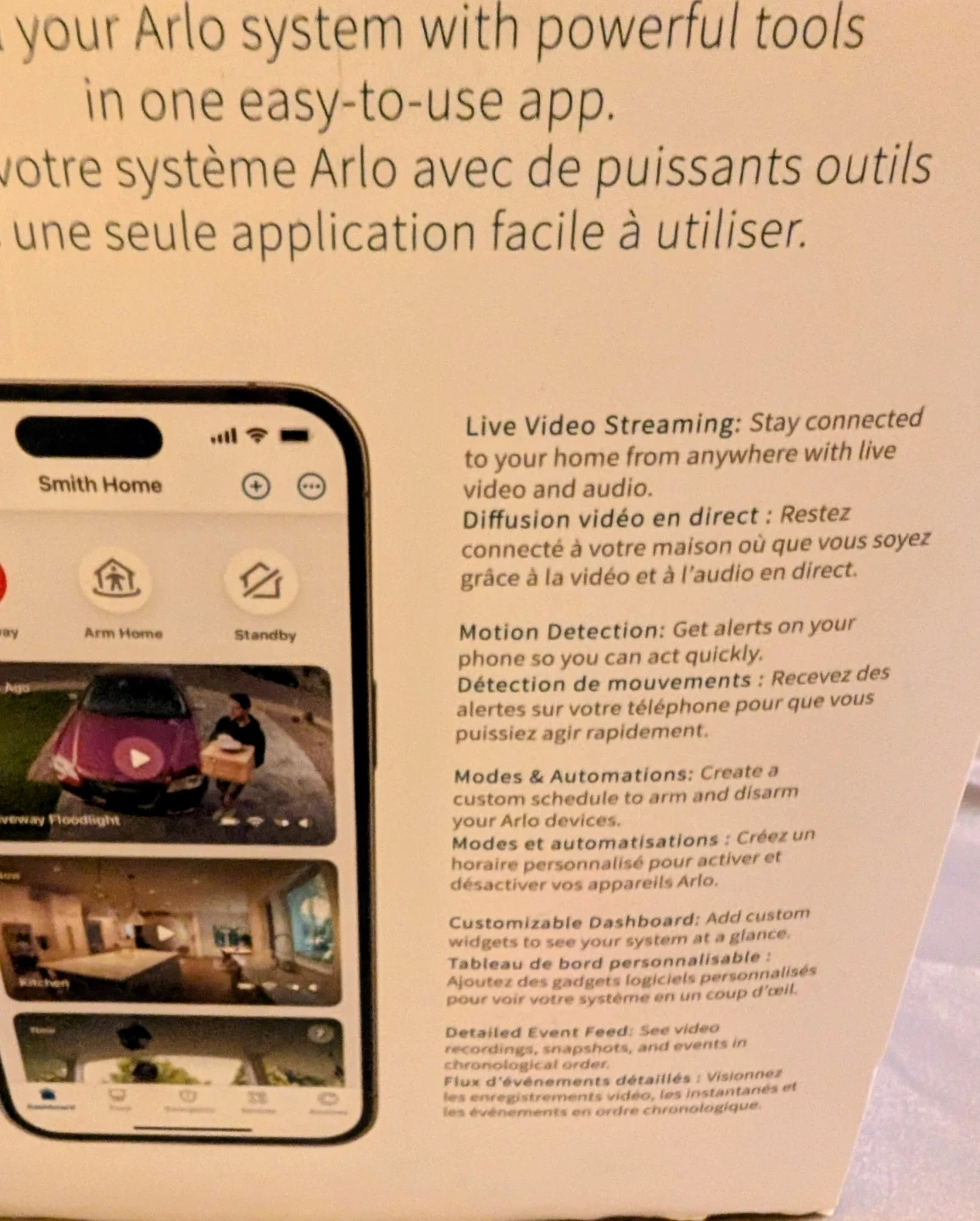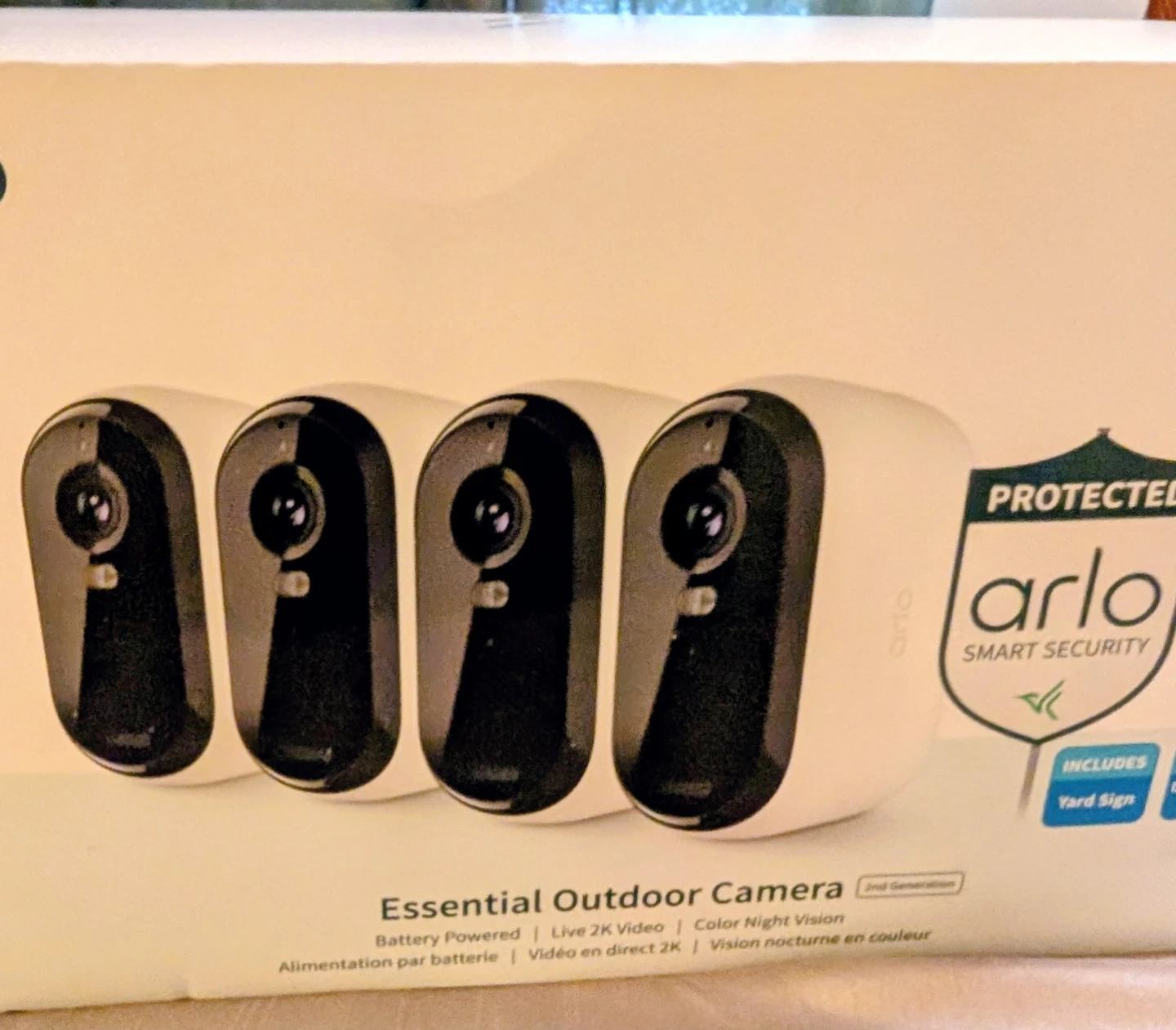 This is a 4-pack of Arlo Essential Outdoor Cameras. These cameras feature 2K video, color night vision, and two-way audio. They are battery-powered for flexible placement.