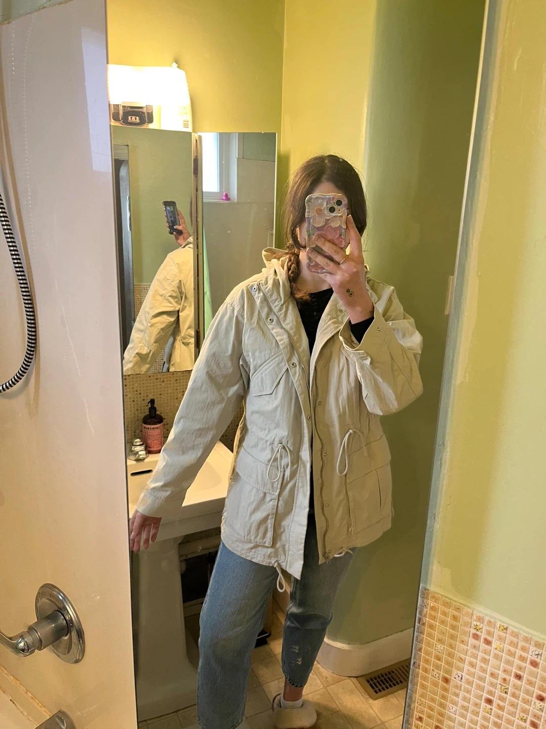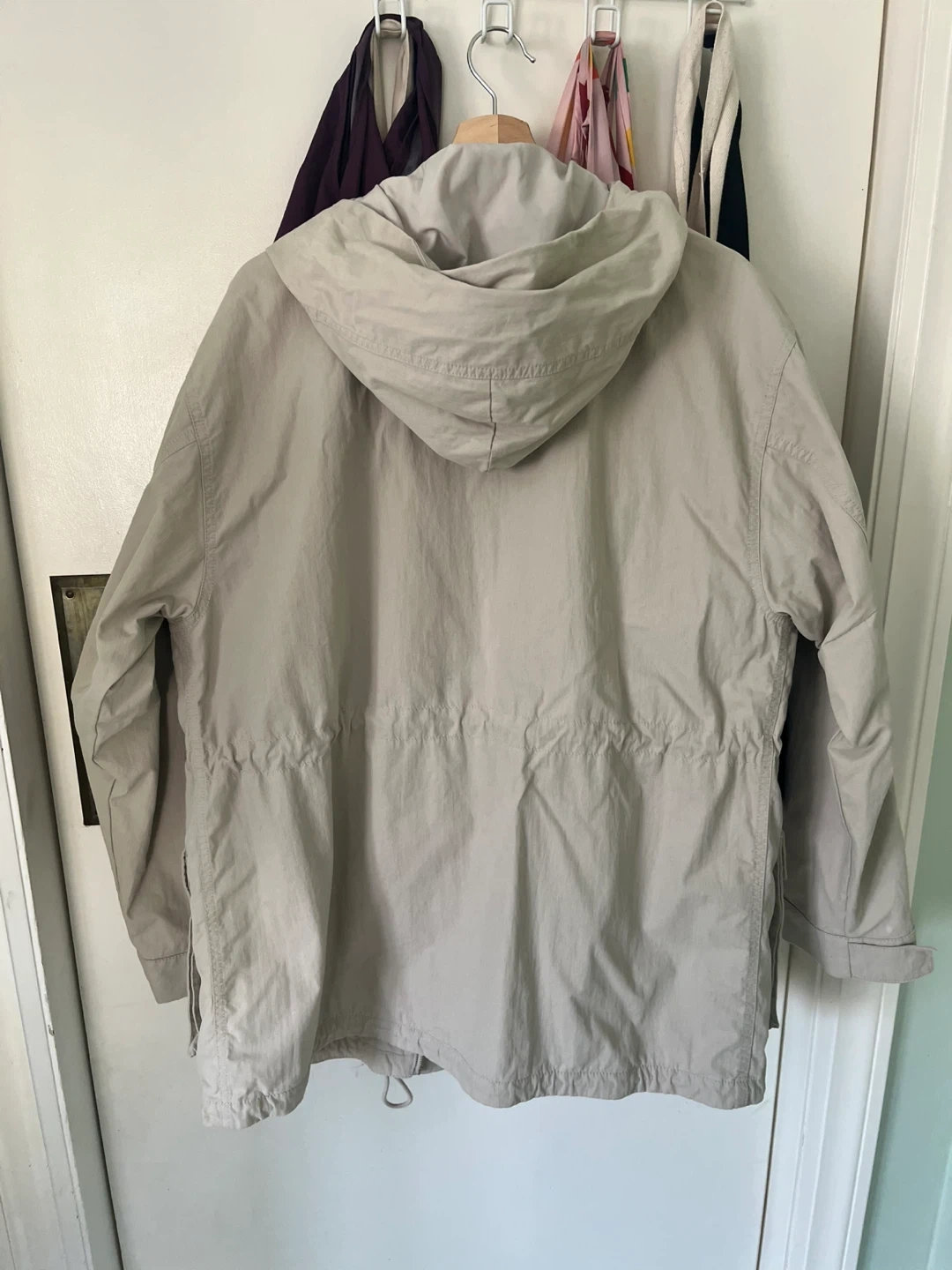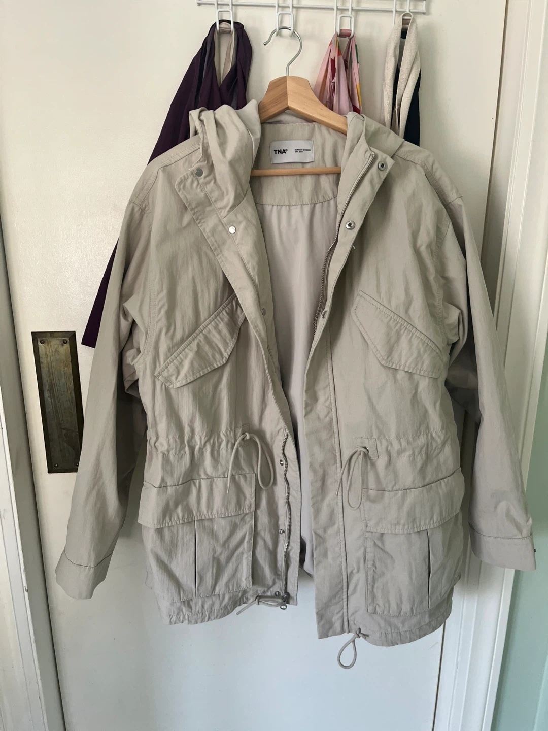 A versatile beige anorak jacket from TNA, featuring a hood and drawstring waist. This jacket is great for layering over casual outfits. Oversized. Perfect for spring! 🌷