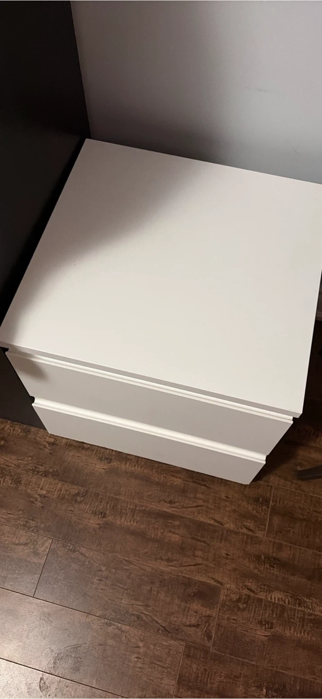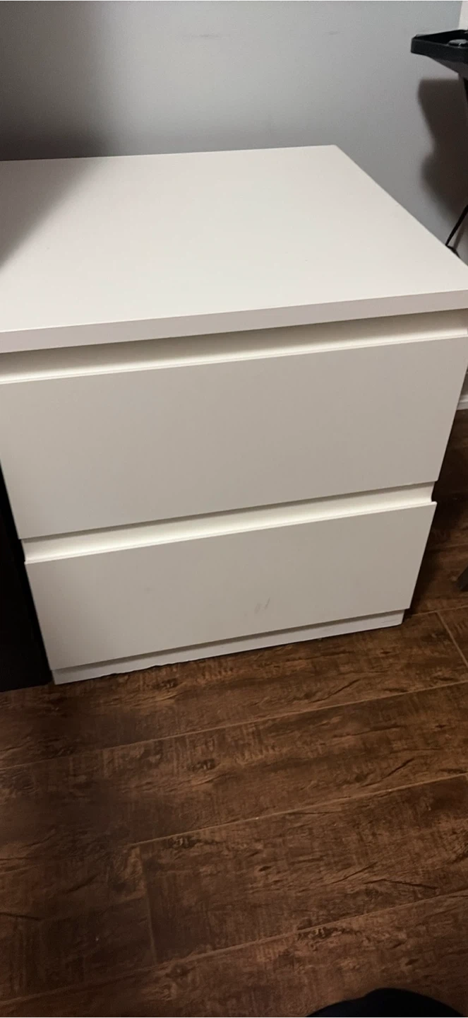 This is a white nightstand with two drawers. It's made of particleboard and has a smooth finish. The drawers glide easily for access to storage.