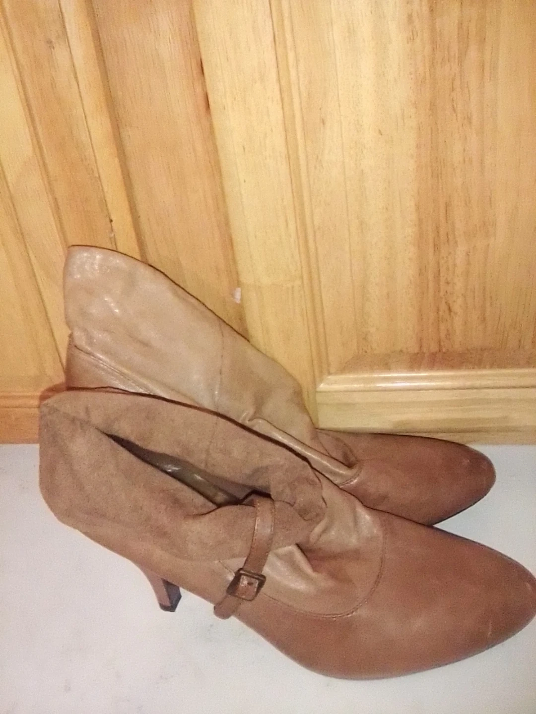 These brown leather ankle boots feature a slouchy design with a buckle strap detail. They have a kitten heel and a pointed toe. These boots are perfect for dressing up any outfit!