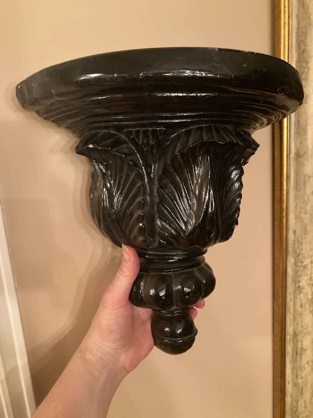 This decorative wall shelf features an ornate, carved design in a classic dark finish. It's a substantial piece that adds a touch of old-world charm to any room. The shelf is ideal for displaying small decorative items, candles or plants.
