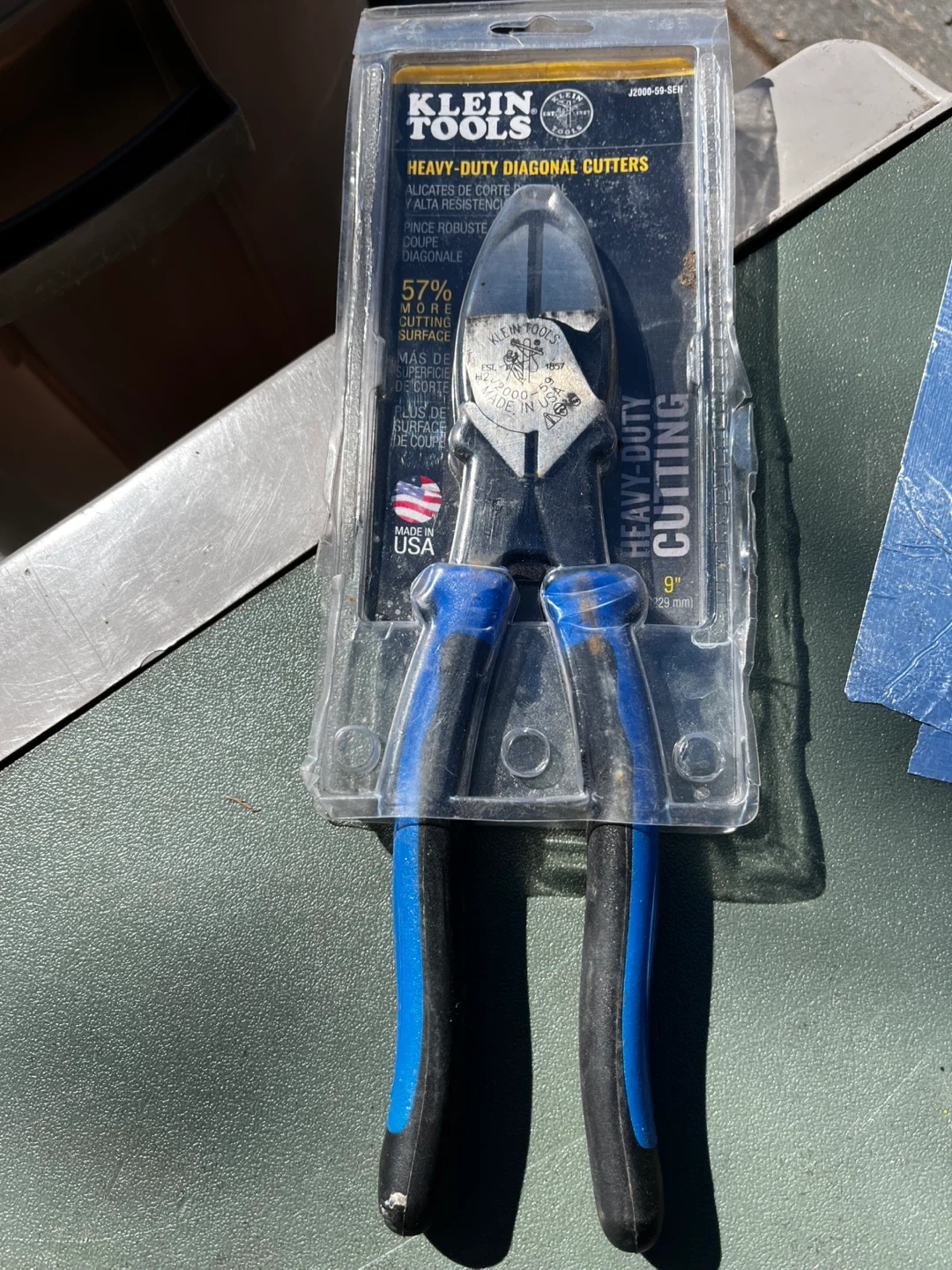 Klein Tools heavy-duty diagonal cutters. These have 57% more cutting surface. They're made in the USA. 9-inch (229mm) size.