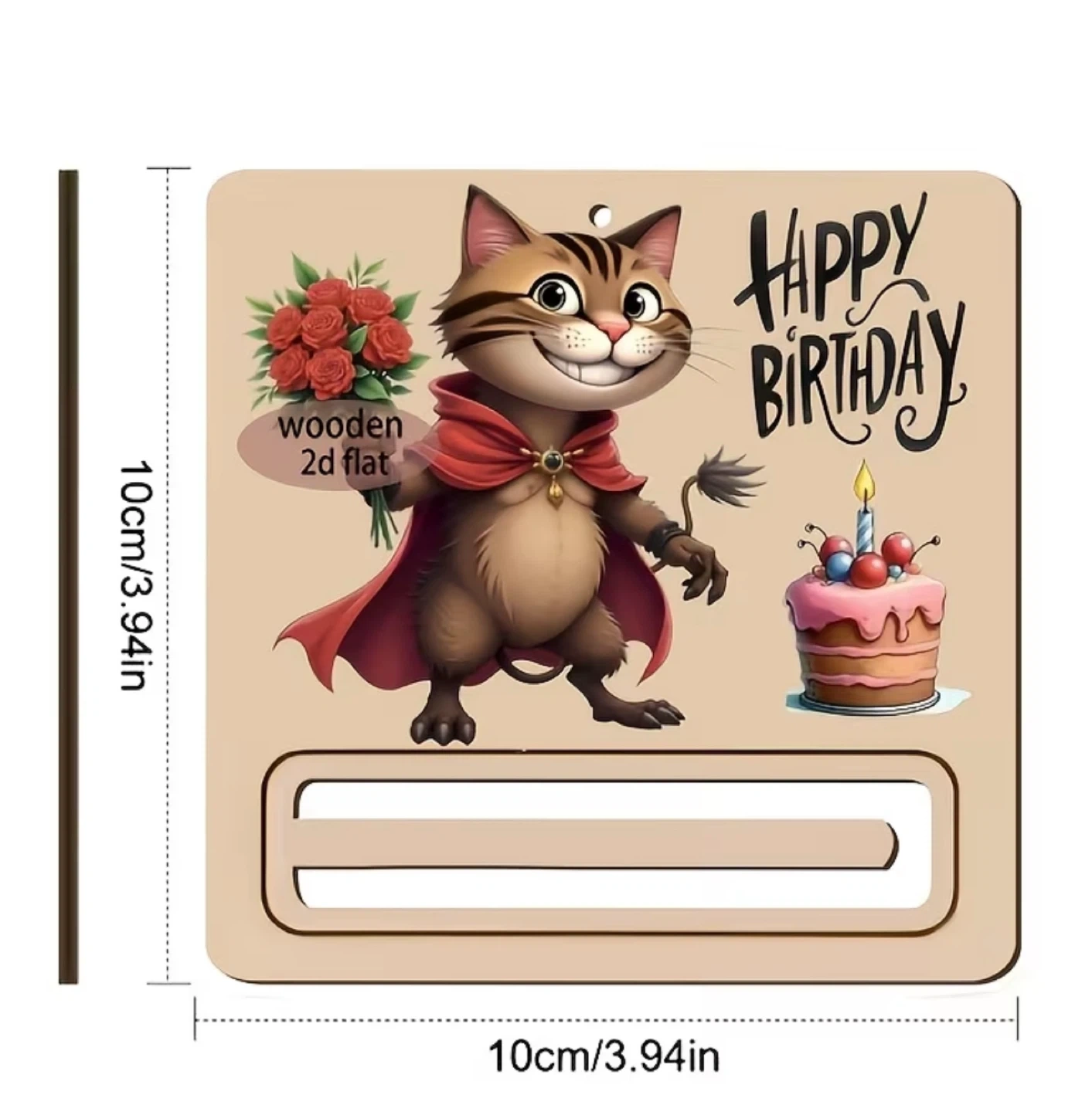 This is a wooden 2D flat happy birthday gift wallet card. It's 10cm by 10cm and 3.94 inches square. It has a slot to hold a rolled-up money.