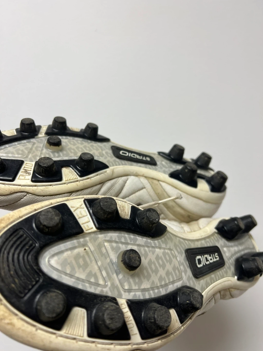 White Lotto Stadio soccer cleats. These cleats have a synthetic leather upper and a durable outsole. They're suitable for firm ground surfaces. Great for playing soccer!
