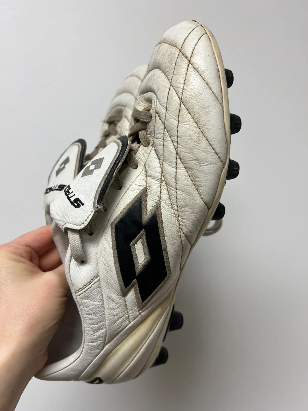 White Lotto Stadio soccer cleats. These cleats have a synthetic leather upper and a durable outsole. They're suitable for firm ground surfaces. Great for playing soccer!