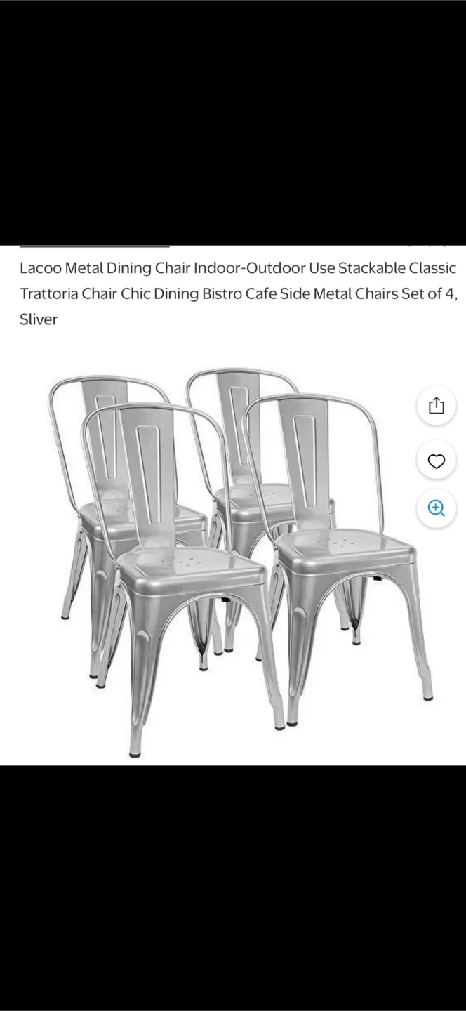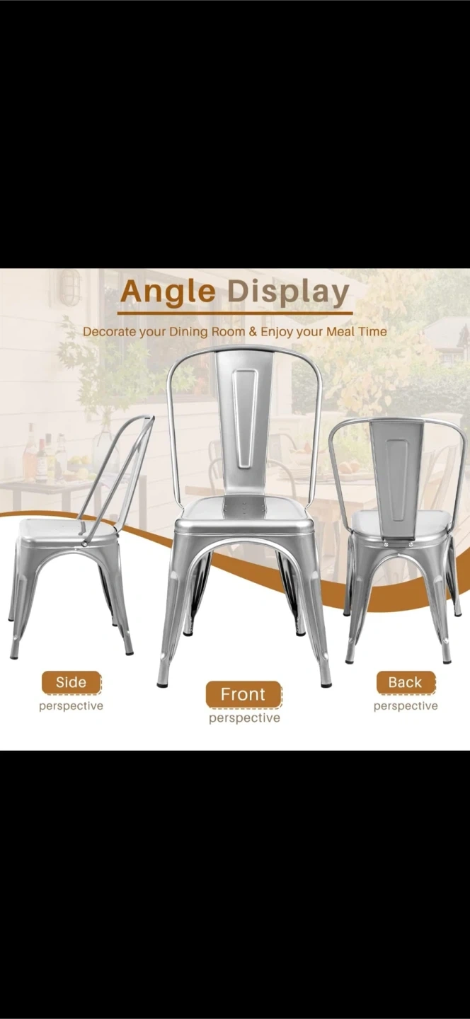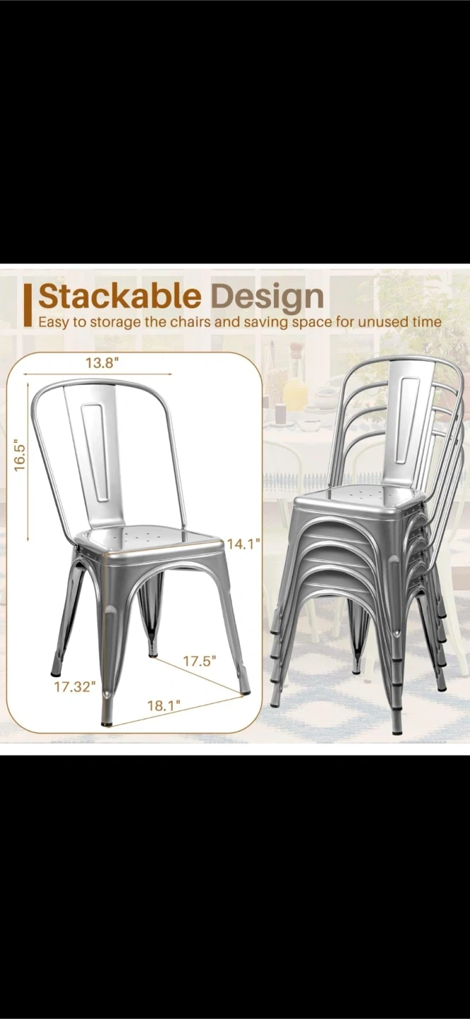Set of 4 Lacoo metal dining chairs in a classic silver finish. These chairs are waterproof with non-mar rubber feet for floor protection. They have a stackable design for easy storage.