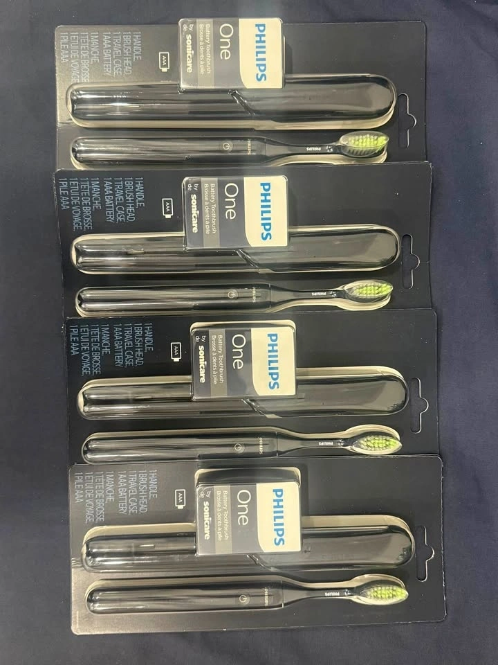 Selling a 4-pack of new, sealed Philips One by Sonicare battery toothbrushes. Each includes the handle, brush head, travel case, and an AAA battery. They feature microvibrations for a clean feel, a SmartTimer with QuadPacer, and the battery lasts about 90 days. Great for travel!
