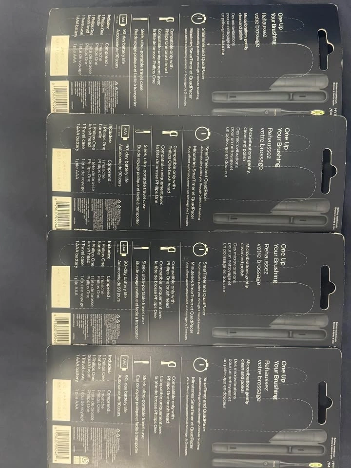 Selling a 4-pack of new, sealed Philips One by Sonicare battery toothbrushes. Each includes the handle, brush head, travel case, and an AAA battery. They feature microvibrations for a clean feel, a SmartTimer with QuadPacer, and the battery lasts about 90 days. Great for travel!