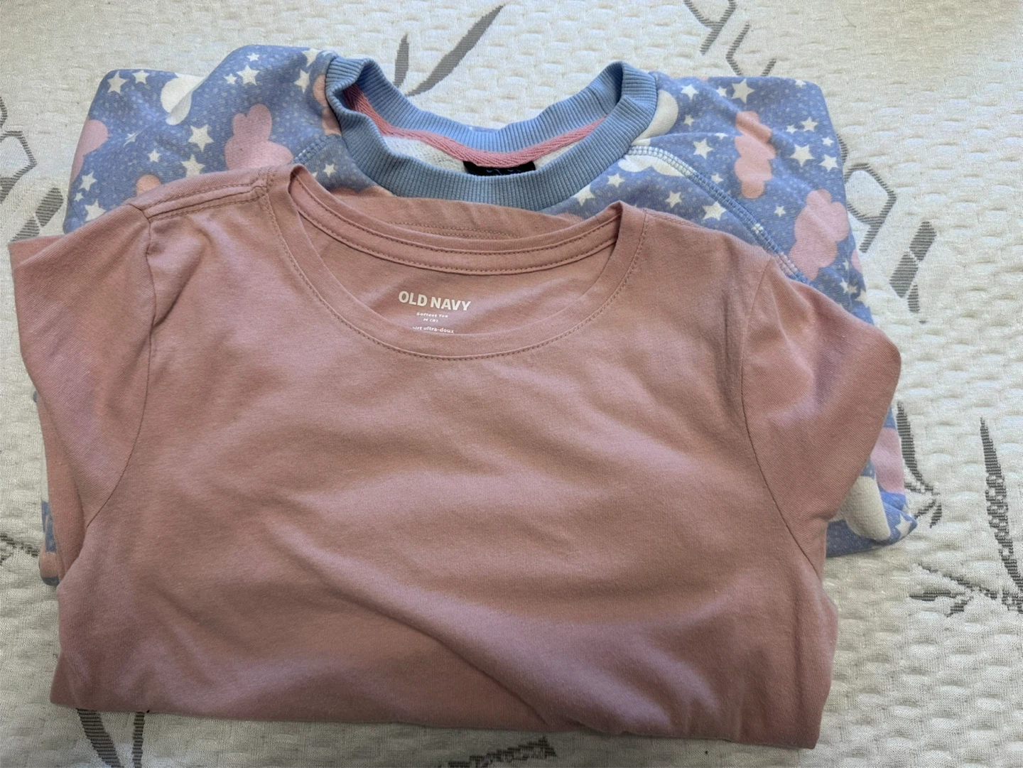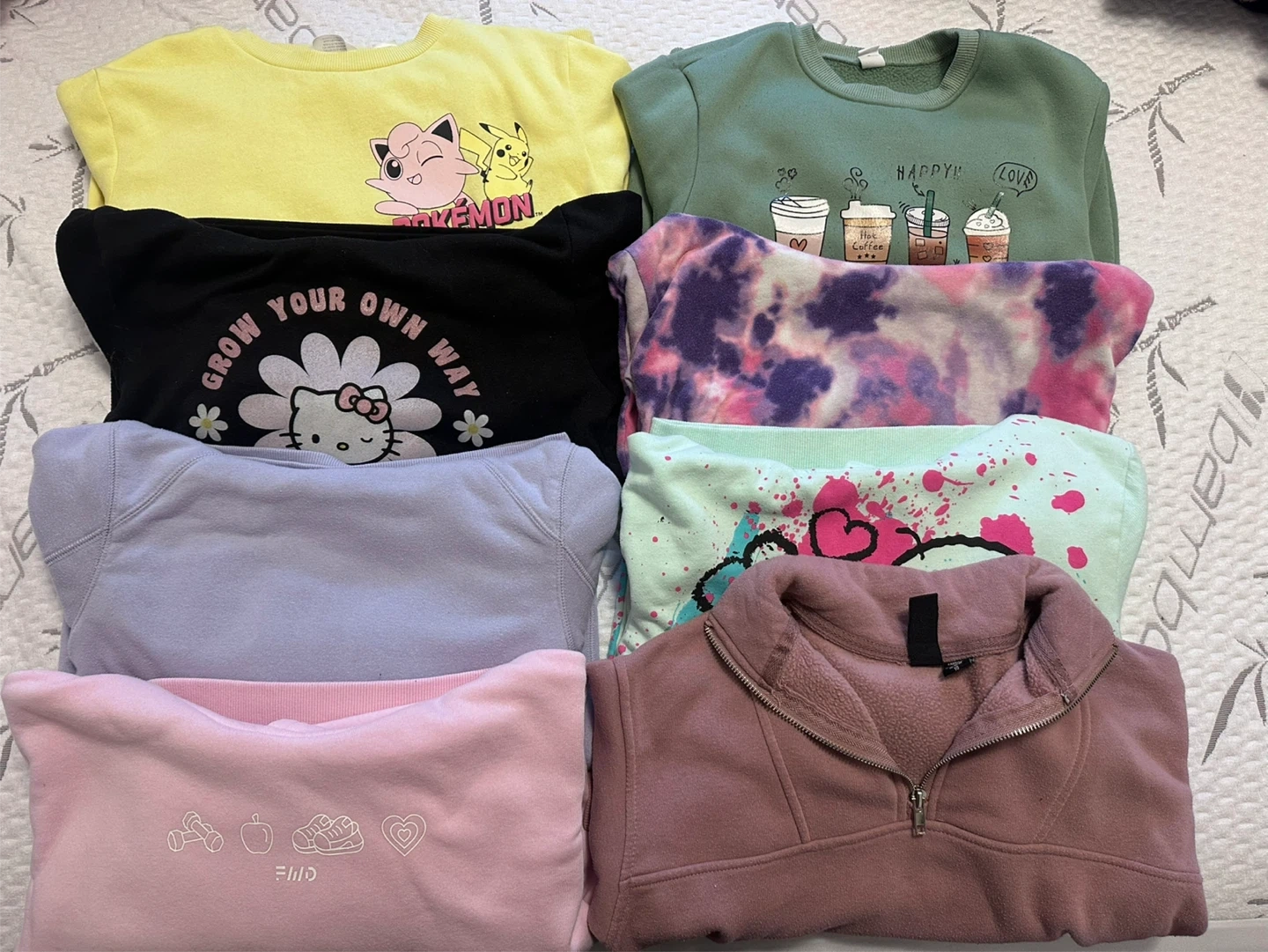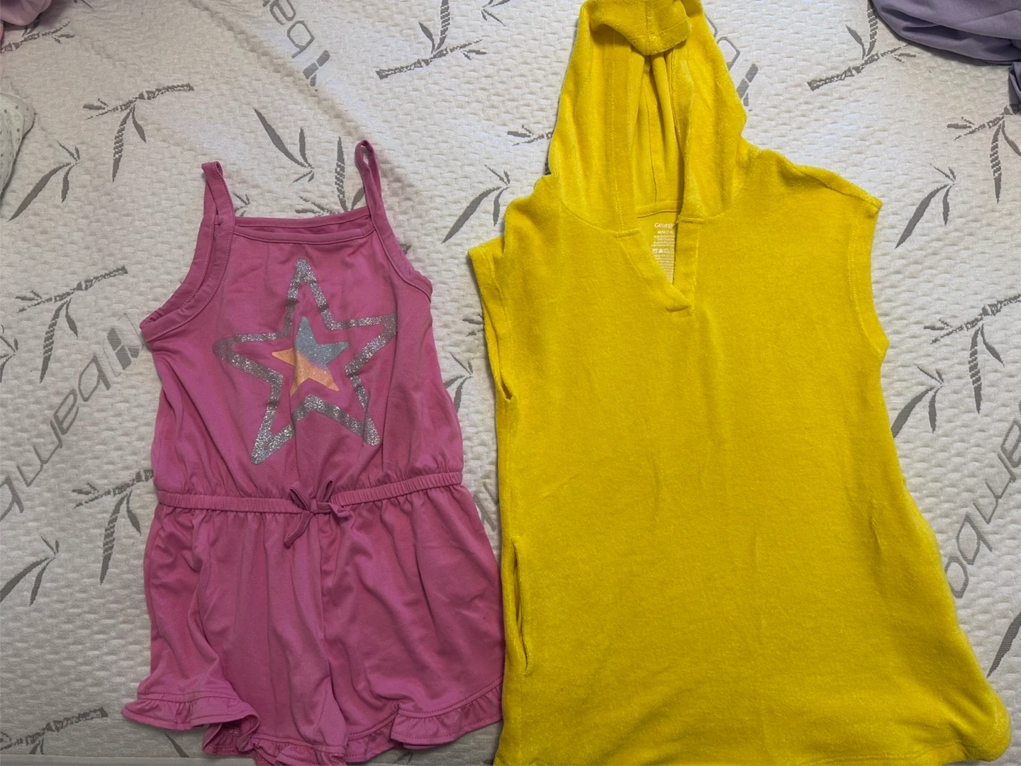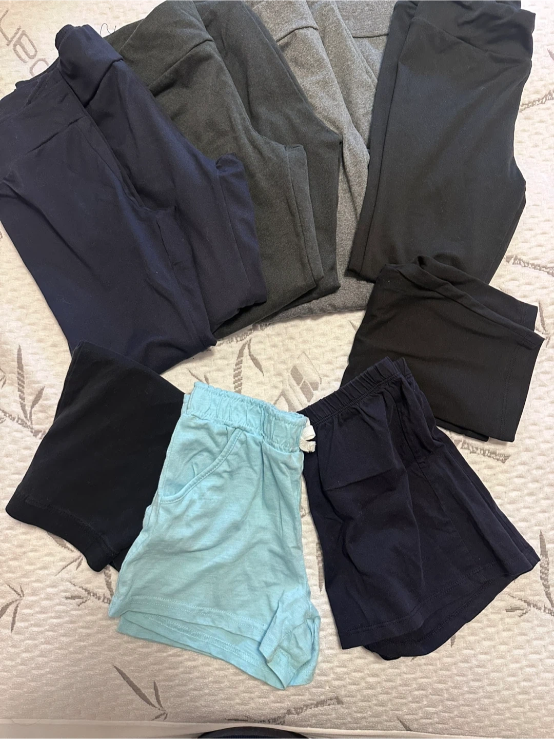 Girls size 7/8 lot of clothes. 3 bathing suits, one cover up for bathing suit, 4 pj sets plus 2 extra pj pants, 9 sweaters, 1 long sleeve shirt, 1 romper, 5 tshirts. 4 shirts, 1 black, 3 light grey, 2 dark grey and 2 navy leggings