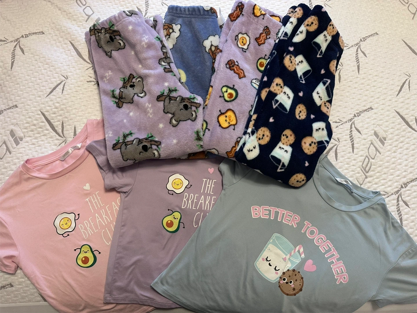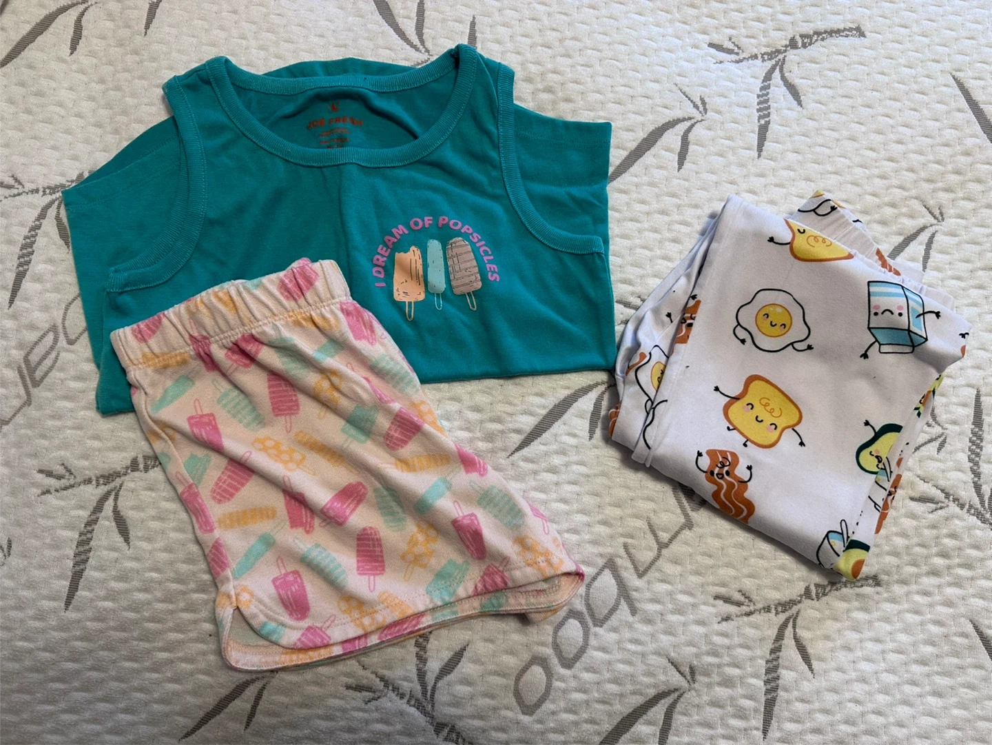 Girls size 7/8 lot of clothes. 3 bathing suits, one cover up for bathing suit, 4 pj sets plus 2 extra pj pants, 9 sweaters, 1 long sleeve shirt, 1 romper, 5 tshirts. 4 shirts, 1 black, 3 light grey, 2 dark grey and 2 navy leggings