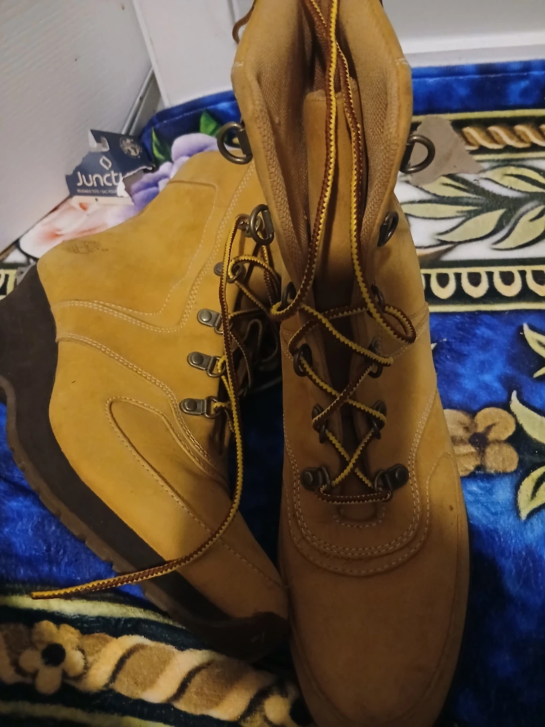 Timberland women's lace-up boots in a classic tan nubuck leather. These boots feature a sturdy construction with metal eyelets and durable laces. The padded collar offers comfort, and the lug sole provides good traction.
