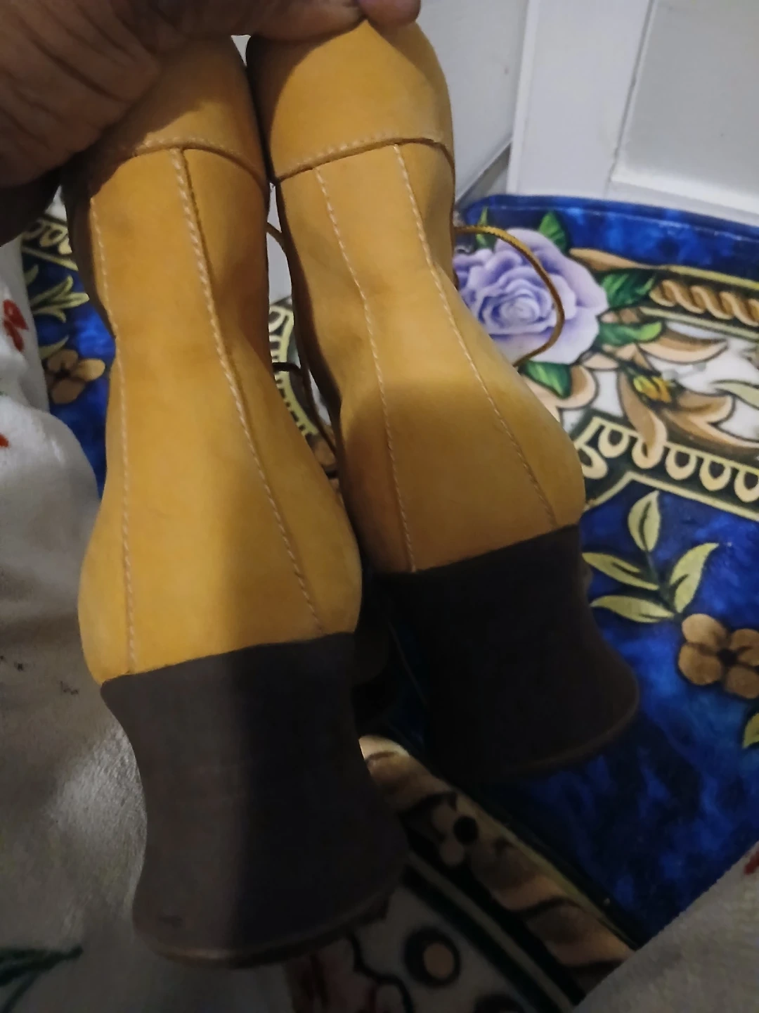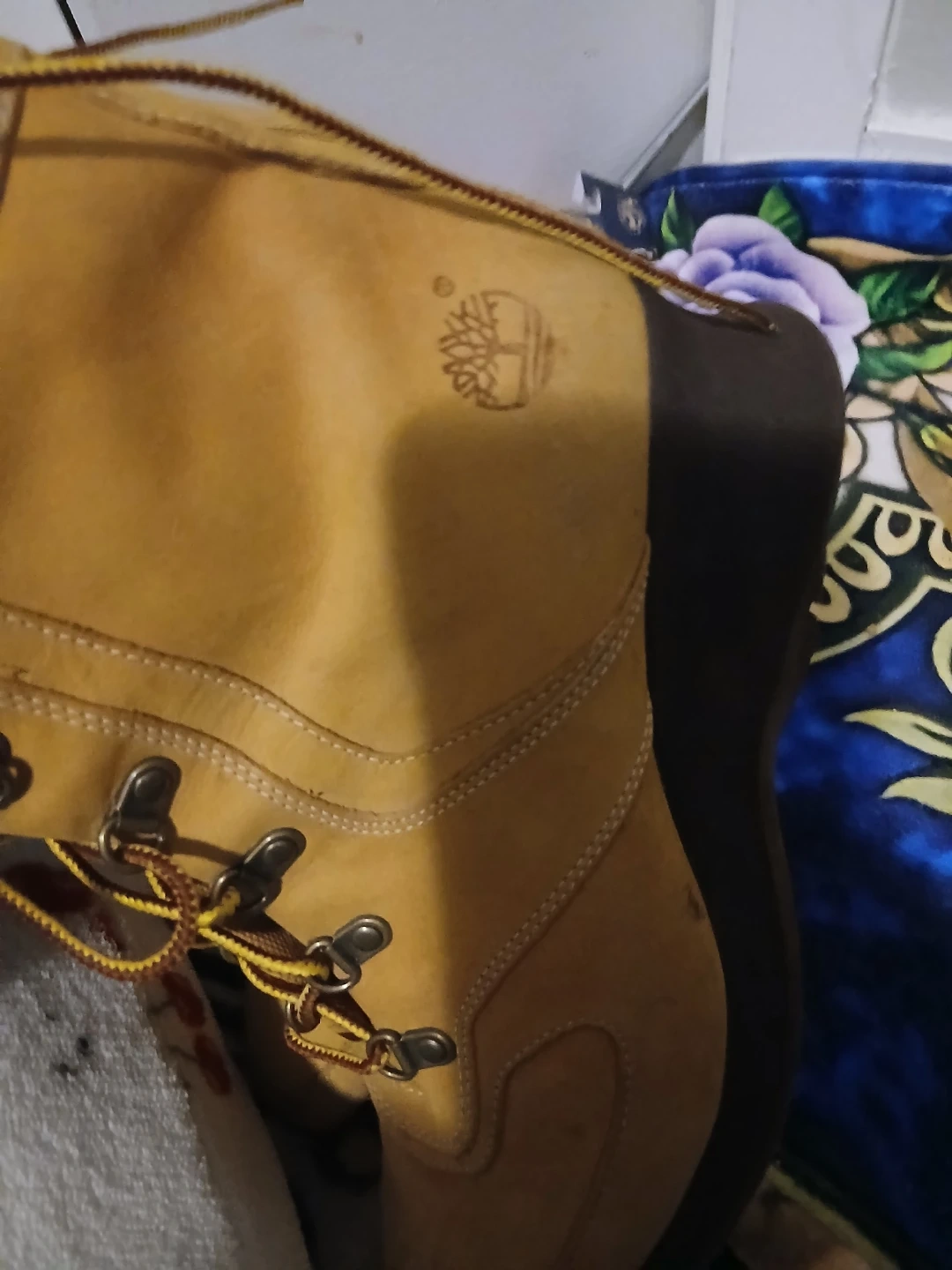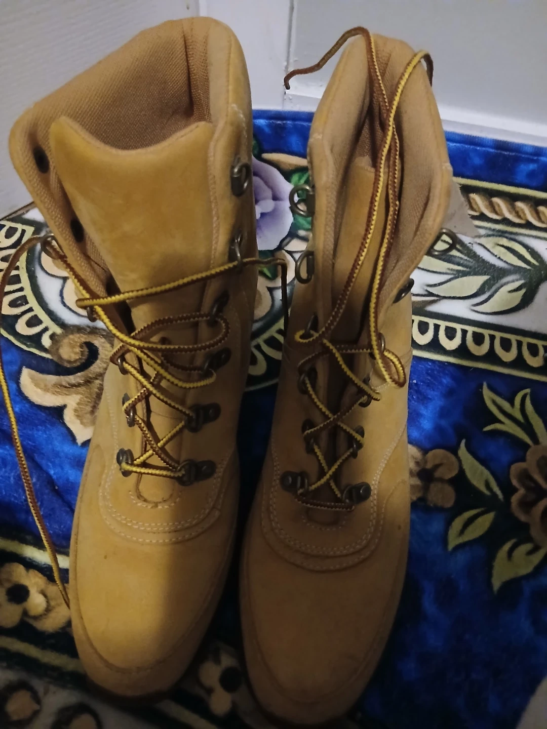 Timberland women's lace-up boots in a classic tan nubuck leather. These boots feature a sturdy construction with metal eyelets and durable laces. The padded collar offers comfort, and the lug sole provides good traction.