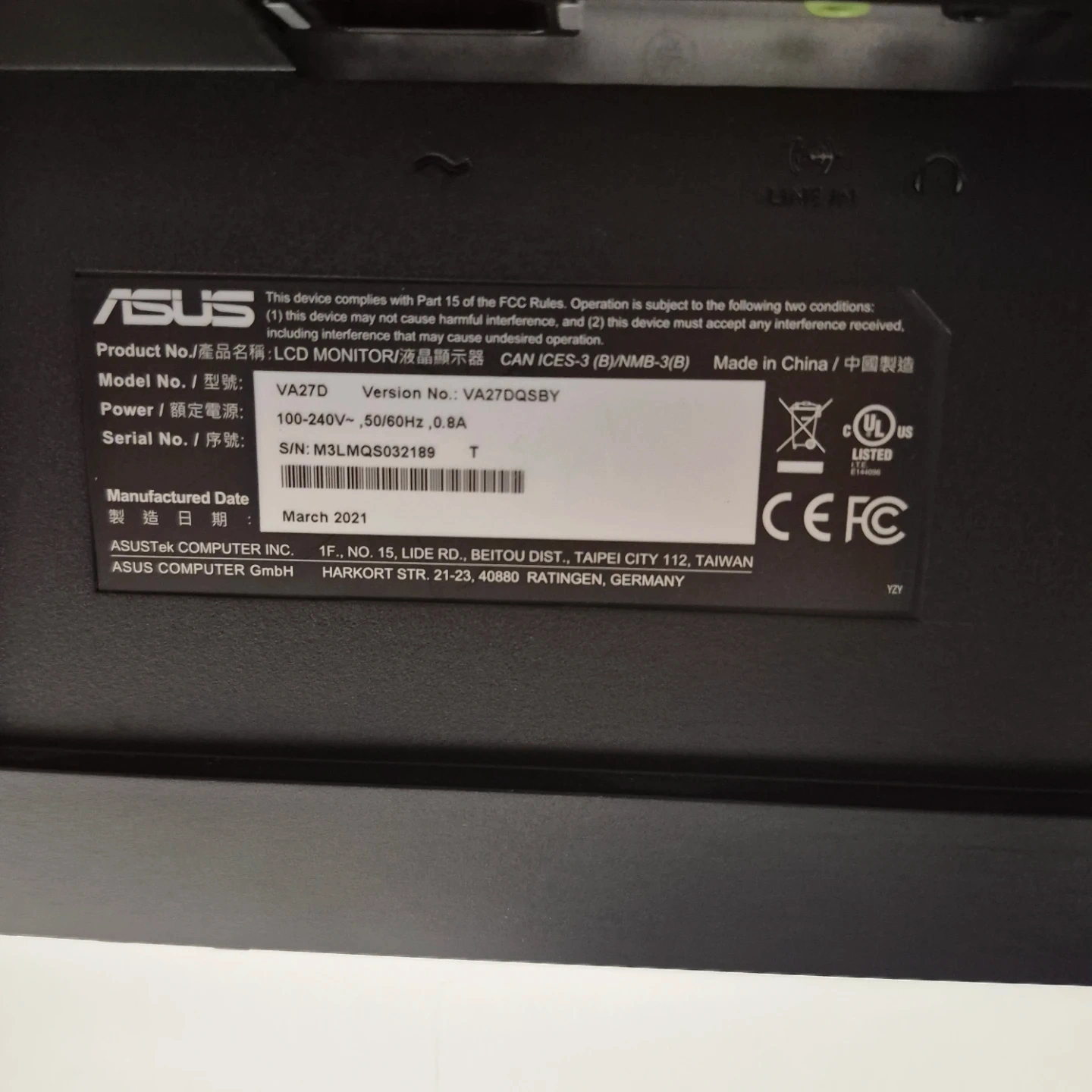 Asus 27 Inch Computer Monitor with HDMI cabel